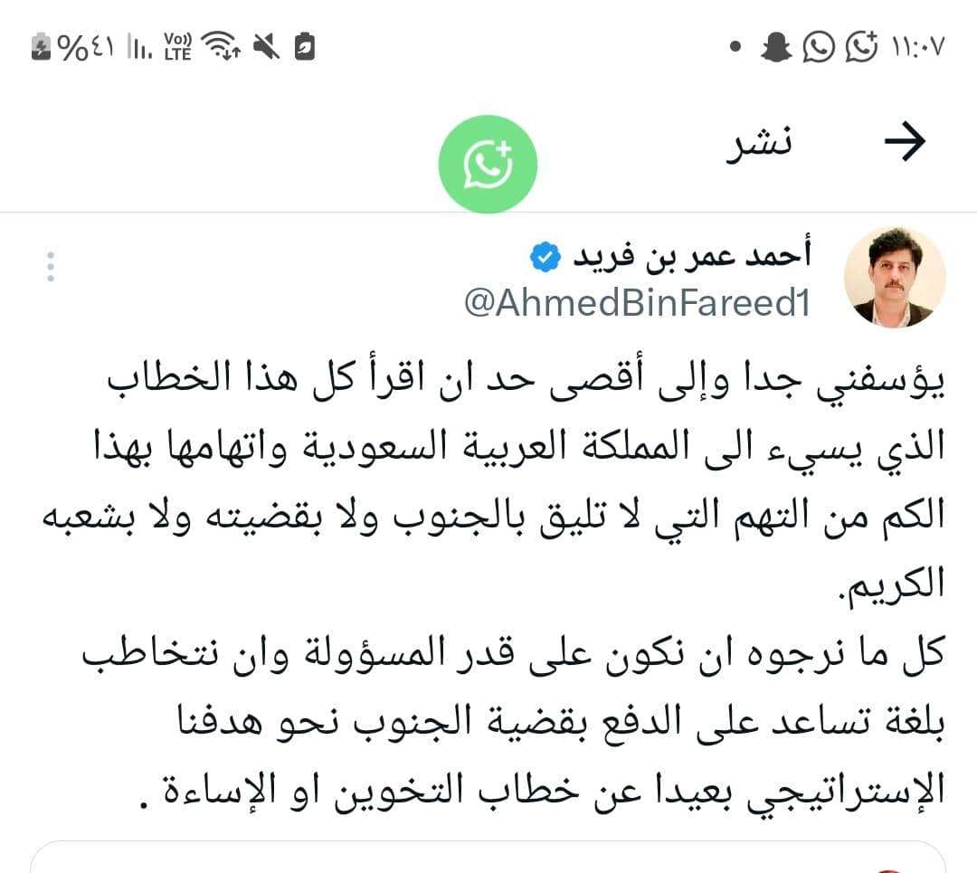 بن فريد: الإساءة للمملكة العربية السعودية لا تليق بالجنوب وقضيته