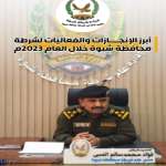 إبرز الإنجازات والفعاليات لشرطة محافظة شبوة خلال العام 2023 م تواصل شرطة محافظة شبوة" جهودها رغم الصعوبات الكثيرة والوضع الاستثنائي الصعب الذي تمر به البلاد...