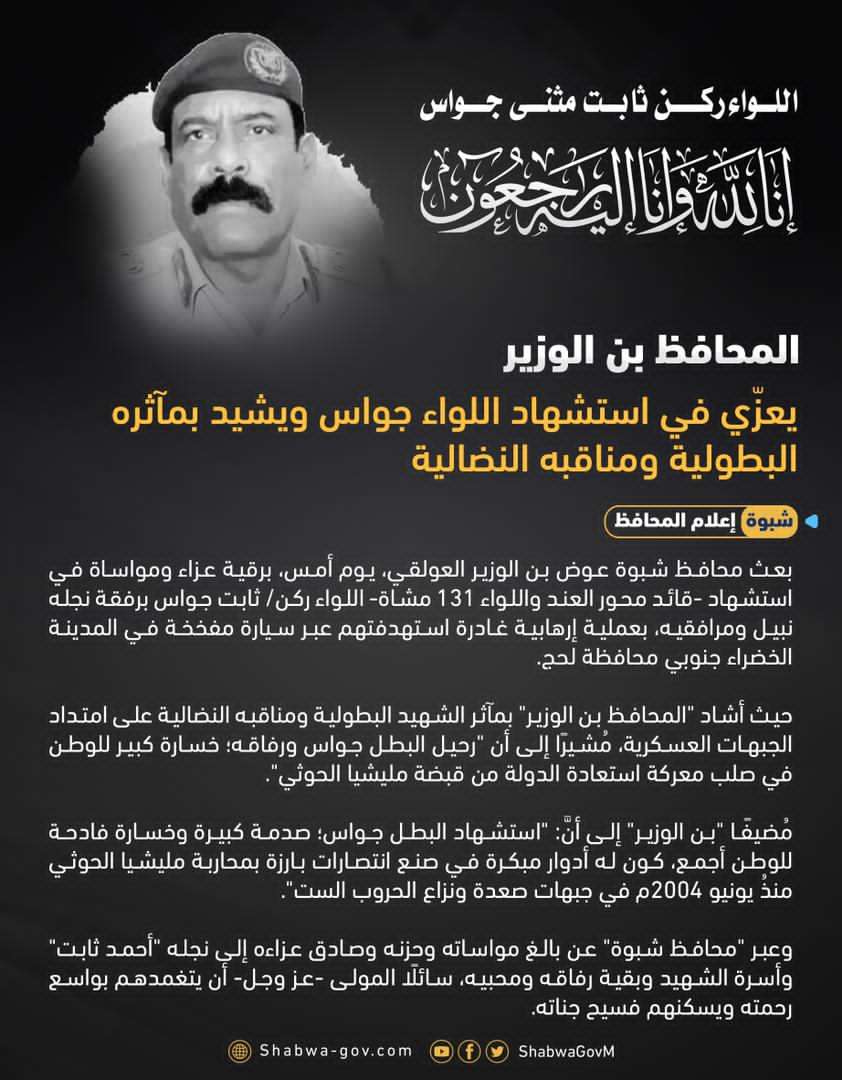 بعث محافظ شبوة عوض بن الوزير العولقي، يوم أمس، برقية عزاء ومواساة في استشهاد -قائد محور العند واللواء 131 مشاة- اللواء ركن/ ثابت جواس برفقة نجله نبيل ومرافقيه، بعملية إرهابية غادرة استهدفتهم عبر سيارة مفخخة في المدينة الخضراء جنوبي محافظة لحج. حيث أشاد "المحافظ بن الوزير" بمآثر الشهيد البطولية ومناقبه النضالية على امتداد الجبهات العسكرية، مُشيرًا إلى أن "رحيل البطل جواس ورفاقه؛ خسارة كبير للوطن في صلب معركة استعادة الدولة من قبضة مليشيا الحوثي". مُضيفًا "بن الوزير" إلى أنَّ: "استشهاد البطل جواس؛ صدمة كبيرة وخسارة فادحة للوطن أجمع، كون له أدوار مبكرة في صنع انتصارات بارزة بمحاربة مليشيا الحوثي منذُ يونيو 2004م في جبهات صعدة ونزاع الحروب الست". وعبر "محافظ شبوة" عن بالغ مواساته وحزنه وصادق عزاءه إلى نجله "أحمد ثابت" وأسرة الشهيد وبقية رفاقه ومحبيه، سائلًا المولى -عز وجل- أن يتغمدهم بواسع رحمته ويسكنهم فسيح جناته.