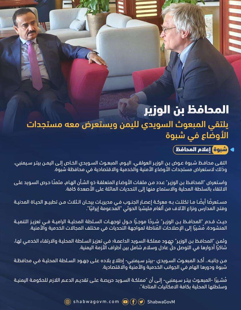 المحافظ بن الوزير يلتقي المبعوث السويدي لليمن ويستعرض معه مستجدات الأوضاع في شبوة
