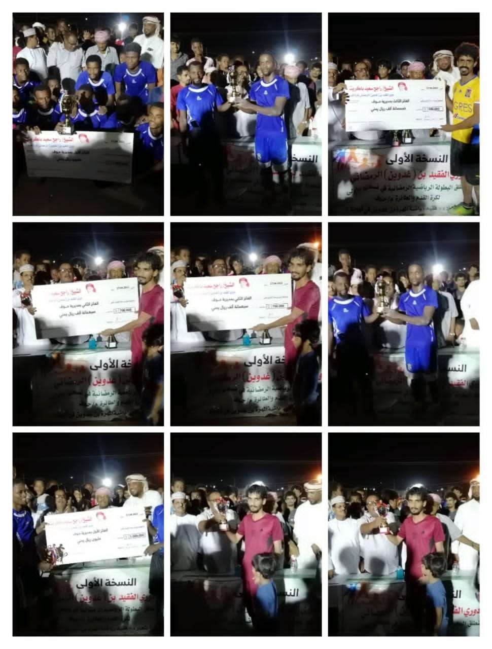 ضمن البرامج والأنشطة الرمضانية الرياضية والدينية والثقافية في مختلف مديريات محافظة المهرة، والتي يرعاها الشيخ راجح سعيد باكريت، اختتم يوم أمس الأحد الدوري الرياضي الرمضاني لكرة القدم والطائرة (دوري الفقيد بن غدوين الرمضاني) في المهرة. حيث أحرز فريق عويسي غدووت كأس دوري الفقيد بن غدوين لكرة القدم والنجم الساحلي بطلاً لدوري الطائرة في مديرية حوف التي انطلقت منافساتها قبل اسبوعين بمشاركة كل فرق المديرية. وكان عويسي غدووت قد توج ببطولة كرة القدم بعدما تغلب على جـردفوت في نهائي مثير حضرت فيه الإثارة والحماس والتشويق، تمكن فيه نجم غدووت رامي يسلم من قيادة فريقه للفوز بهدف نظيف كان كافي لقيادة فريقه لخطف اللقب فيما اكتفى جردفوت بالوصافة وأهلي حوف بالمركز الثالث وذهبت الجوائز الفردية أفضل لاعب لمدافع جردفوت عادل مشخفي وهداف الدوري زيد يسلم مهاجم غدووت وأفضل حارس علي عيسى حارس جردفوت. وأما في منافسات الطائرة فاز النجم الساحلي بلقب البطولة بعدما تفوق على أهلي حوف بشوطين نظيفين في مباراة جماهيرية كبيرة. وفي نهاية المباراتين جرت مراسيم تسليم الجوائز الفردية، ففي كرة القدم حصل الفريق الحاصل على المركز الأول على مبلغ مليون ريال يمني، والمركز الثاني 700 ألف ريال يمني والمركز الثالث 500 الف ريال يمني، مقدمة من الشيخ راجح باكريت، فيما ذهبت جائزة أفضل لاعب لمدافع جردفوت عادل مشخفي مبلغ 200 ألف، وهداف الدوري ، زيد يسلم مهاجم غدووت مبلغ 200 ألف وأفضل حارس مرمى علي عيسى حارس جردفوت مبلغ 200 ألف . كما حصل بطل كرة الطائرة النجم الساحلي على جائزة مالية 500 الف ريال ، وأهلي حوف على جائزة مالية 300 ألف ريال مقدمة من الشيخ راجح باكريت عضو مجلس الشورى. حضر المباراة النهائية أشقاء الفقيد الأستاذ سالم عقيل باعمر مدير منفذ شحن، وحفيظ عقيل، والشيخ سالم محاد ، وعدد من الوجهاء والشخصيات الرياضية والاجتماعية في المديرية. وعبرت الجماهير الرياضية والشبابية بمديرية حوف عن سعادتها بهذه الخطوة الجبارة والدعم والاهتمام الكبيرين الذي قدمه الشيخ راجح باكريت لإنعاش الحركة الرياضية في المديرية. •بطولة الفقيد بن غدوين لكرة القدم بمديرية حصوين: اختتمت فعاليات بطولة الفقيد بن غدوين الرمضانية لكرة القدم بمديرية حصوين مساء يوم الأحد، بفوز فرسان حرضنوت على منافسه نمور حصوين بهدفين مقابل هدف في المباراة النهائية التي جمعت الفريقين على ملعب منتجع قشن الرياضي بحضور الأستاذ حيدر المحضار مدير مكتب الشباب والرياضة بمديرية قشن ونائب رئيس نادي فرتك الرياضي رئيس اللجنة المنظمة للمسابقة بمديريةحصوين الأستاذ عبد الهادي قاسم عنوش وعدد من الجماهير والمهتمين بالشأن الرياضي بالمديرتين. وحسم فرسان حرضنوت حصوله على بطاقة التأهل في إطارالتصفيات المؤهلة إلى نهائيات بطولة الفقيد بن غدوين الرمضانية لكرة القدم التي يرعاها الشيخ راجح سعيد باكريت عضو مجلس الشورى بمشاركة أكثر من 150 فريق في عموم مديريات محافظة المهرة . وبهذا الفوز الثمين يصبح فرسان حرضنوت هو الممثل لمديرية حصوين للمنافسة على نهائيات البطولة في المواجهات الحاسمة والتنافسية بين أبطال المديريات وصولاً إلى تحقيق لقب بطولة الفقيد بن غدوين الرمضانية في نسختها الأولى برعاية الشيخ راجح باكريت. الجدير بالذكر أن لجنة البطولة بمديرية حصوين قدمت الجوائز المالية المقدمة من راعي المنافسة الشيخ راجح سعيد باكريت عضو مجلس الشورى حسب الشروط المعلنة مسبقاً في المسابقة وهي كالتالي:- المركز الأول مبلغ مليون ريال. المركز الثاني الوصيف مبلغ 700 الف ريال. المركز الثالث مبلغ 500 الف ريال. كما منحت مهاجم النمور اللاعب علي حمدون لقب هداف المسابقة بينما منحت لقب أفضل لاعب لفارس حرضنوت اللاعب إسحاق مبارك . في ذات السياق منحت اللجنة لقب أفضل حارس للحارس علي محمد حارس فريق نمور حصوين. •دوري الفقيد بن غدوين الرمضاني لكرة القدم بمديرية قشن: توج فريق منصاف بطلاً لدوري الفقيد علوي بن 