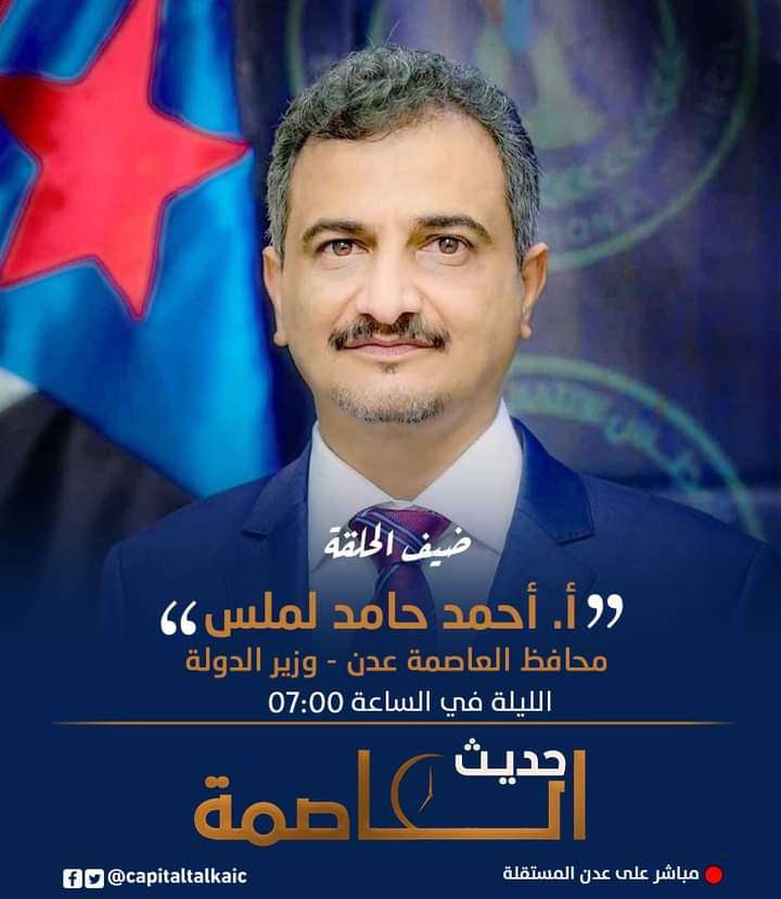 تستضيف قناة عدن مستقله في برنامج حديث_العاصمة أحمد حامد لملس - محافظة العاصمة عدن وزير الدول في تمام الساعة 7م بتوقيت العاصمة عدن