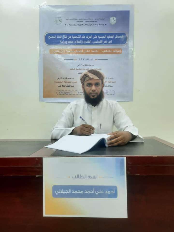 عدن الحدث / عادل القباص . نال الشيخ الحبيب الباحث / أحمد علي أحمد محمد الجيلاني اليوم الأربعاء 21 / ديسمبر /2022م درجة الدكتوراه بامتياز من كلية الدراسات العليا جامعة أم ردمان الإسلامية بالسودان - عن أطروحته المسومة بـ ( المسائل الفقهية المبنية على العرف عند الشافعية من خلال تحفة المحتاج إلى شرح المنهاج لابن حجر الهيتمي ـ الطهارة والصلاة (جمعاً ودراسةً) تخصص.(فقه مقارن) . وأشادت اللجنة بجهود الباحث الجيلاني وموضوع أطروحته العلمية والبحثية وأعلنت قبول الأطروحة ومنحه درجة الدكتوراه بتقدير عام امتياز مع مرتبة الشرف الأولى والتوصية بطباعة الرسالة العلمية . وبهذه المناسبة نتقدم باحر التهاني والتبريكات للدكتور أحمد ، متمنين له مزيدًا من العلم والمعرفة، سائلين من الله له دوام التوفيق ، وان ينفع الله بعلمه البلاد والعباد .