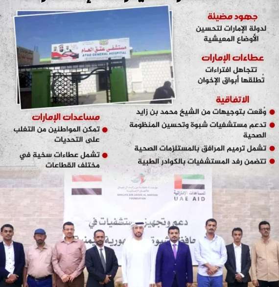 تبذل المؤسسات الإغاثية لدولة الإمارات العربية المتحدة جهودا مضنية في سبيل تخفيف المعاناة عن المرضى، ومنها اتفاق تشغيل عدد من المستشفيات والمرافق الصحية بشبوة