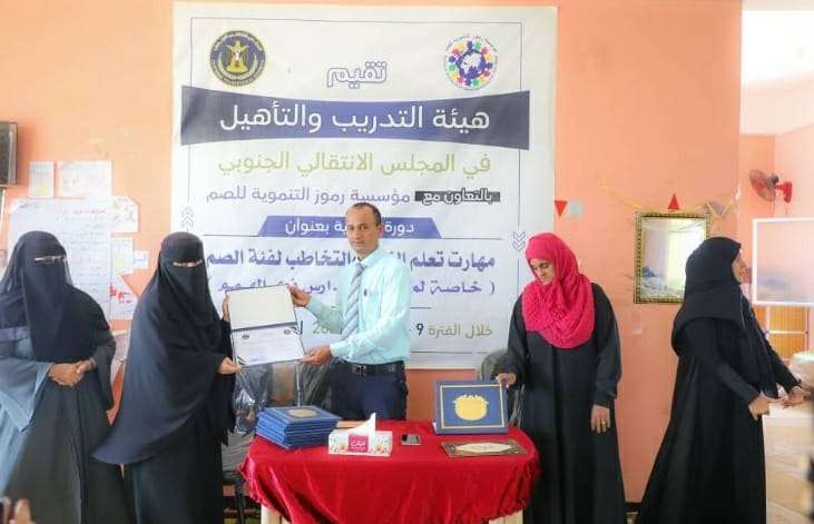 اختتمت هيئة التدريب والتأهيل في المجلس الانتقالي الجنوبي، اليوم الخميس، في العاصمة عدن، الدورة لتدريبية في "مهارات تعلم النطق والتخاطب لفئة الصم والبكم" لمعلمات مدارس ذوي الهمم، والتي أقيمت بالتعاون مع مؤسسة رموز التنموية. وأكد الدكتور ماهر محمد الدلعوس نائب رئيس هيئة التدريب والتأهيل في كلمة الاختتام إلى أن قيادة المجلس الانتقالي وجهة بالاهتمام بذوي الهمم من الصم والبكم وإقامة لهم الدورات التدريبية من أجل رفع قدراتهم على التواصل مع الآخرين ليصبحوا جزء من المجتمع. واشار الدلعوس إلى أنه تم إعطاء المتدربات المشاركات في الدورة مجموعة من المعارف والمهارات من مؤسسة الصم والبكم وجمعيتي الاحتياجات والمعاقين حركيٱ في العاصمة عدن، دروسا حول لغة الإشارة وكيفية التعامل مع الاخرين لتأدية عملهم مع الأطفال ذوي الهمم من الصم والبكم. وتقدمت الأستاذة أيمان عمر هاشم المدير التنفيذي لمؤسسة رموز للصم والبكم بالشكر والتقدير للمجلس الانتقالي الجنوبي ممثلة بهيئة التدريب والتأهيل على ما قدموه من أجل نجاح الدورة التدريبية، موضحة بأن هذه الدورة فاتحة خير لاستهداف المعلمين والمعلمات في العاصمة عدن خلال الفترة القادمة. وتلقت المشاركات في الدورة، من الأستاذة المدربة أريج أحمد، تعريفات حول الصمم وأسبابه وانواعه، وتعريف النطق والتأهيل النطقي، وكيفية تهيئة الطفل وتدريب جهاز النطق وتقوية أعضاءه، وماهية متطلبات إصدار الصوت.