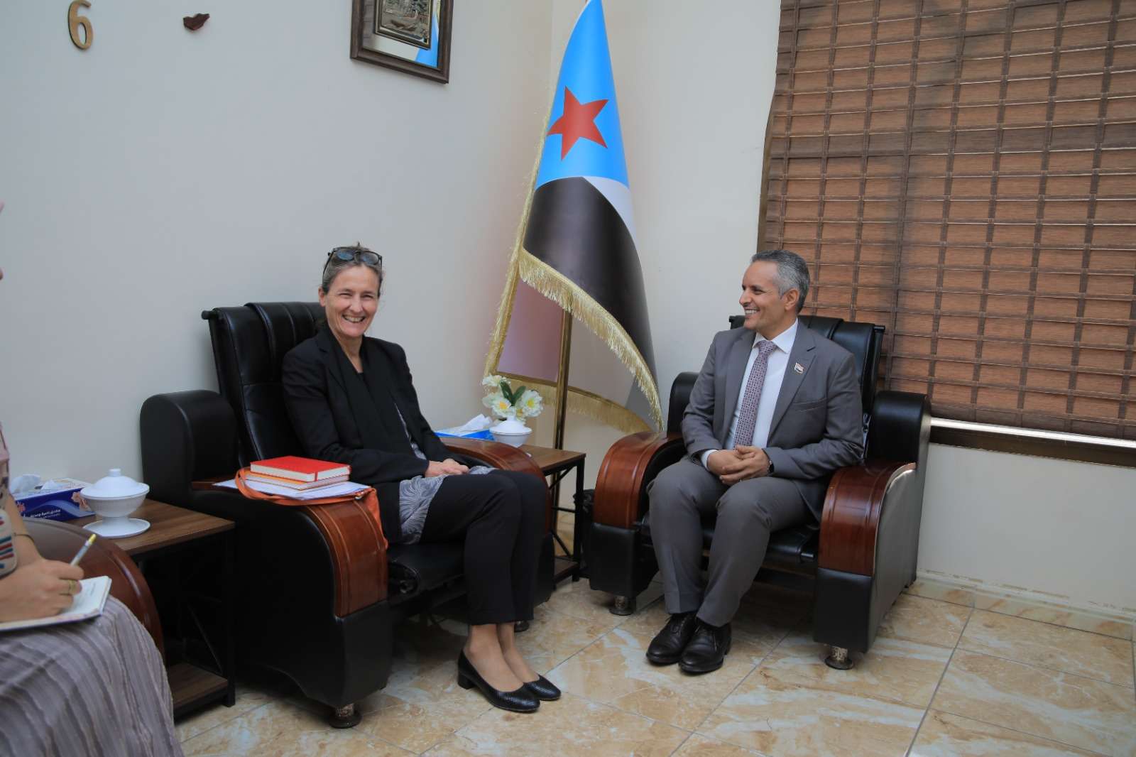 استقبل الاستاذ مختار اليافعي نائب رئيس الهيئة الوطنية للإعلام الجنوبي اليوم الخميس بمقر الهيئة بالعاصمة عدن سعادة جانيت سيبن سفيرة مملكة هولندا لدى بلادنا. ولدى استقباله رحب الأستاذ اليافعي بسعادة السفيرة لدى زيارتها للعاصمة عدن والهيئة الوطنية للإعلام الجنوبي ، مؤكدا أن عدن ترحب بزيارة السفيرة باعتبارها مدينة للسلام والتسامح والتنوع وتشهد الأمن والاستقرار على كافة المستويات . وجرى في اللقاء مناقشة مستجدات الأوضاع في المنطقة حيث أكد الاستاذ اليافعي على موقف المجلس الانتقالي الجنوبي بالحرص على انجاح عملية السلام ودعوته على جعل قضية شعب الجنوب ضمن اطار تفاوضي في عملية السلام باعتبارها قضية محورية لتحقيق سلام شامل ودائم ومستدام ويحقق تطلعات شعبنا في الجنوب ببناء الدولة الجنوبية المدنية والفيدرالية. واشار اليافعي في سياق حديثه بأن ما يحدث من أزمة في البحر الاحمر وخليج عدن وباب المندب من قرصنة بحرية تتعمدها مليشيات الحوثي لاتخدم القضية الفلسطينية بل تخدم أسيادها في إيران ومن أجل تحسين صورتها في المجتمع المحلي والعربي، موضحا ان هذه القرصنة سوف تؤدي إلى تعطيل مسار عملية السلام كما ستؤثر على الامن الغذائي في بلادنا بسبب تعطل الملاحة الدولية، مؤكدا أن على المجتمع الدولي الوقوف بحزم أمام هذه الأعمال الارهابية. وأهاب اليافعي بسعادة السفيرة أن تعمل بما يمكن القيام به في المساهمة في تأهيل وتدريب الكوادر الوطنية والمؤسسات العامة ومنها الإعلامية من أجل خلق جيل واع يساهم في صياغة المستقبل بعيدا عن الحروب والاقتتال واستخدام سلاح العلم في مواجهة التخلف والتطرف والإرهاب. من جانبها عبرت سعادة السفيرة عن امتنانها بزيارة العاصمة عدن ومقر الهيئة الوطنية للإعلام الجنوبي للتعرف على مهام الهيئة، مبدية اهتمامها بالجانب الإعلامي نحو تحقيق الهدف السامي في صياغة خطاب ينشد السلام وينبذ الحرب. وفي الختام أهدى نائب رئيس الهيئة الوطنية للإعلام سعادة السفيرة درع الهيئة تقديرا لجهود المملكة الهولندية والسفيرة سيبن في عملية إحلال السلام في بلادنا وتطلعا من شعب الجنوب وقيادته للشعب الهولندي في تعزيز علاقة الشراكة والتعاون.