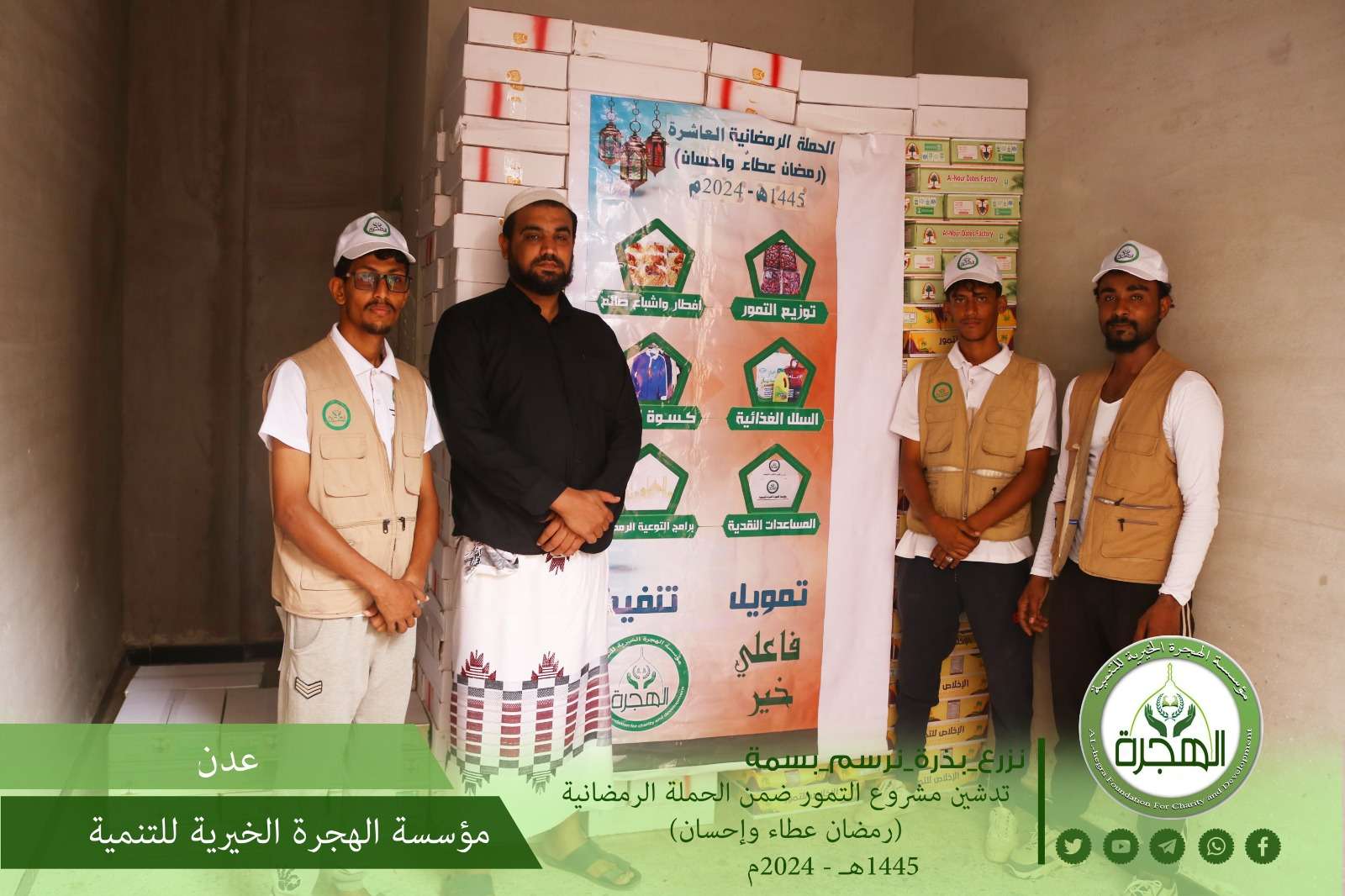 بدعم وتمويل من فاعلي خير ، دشنت مؤسسة الهجرة الخيرية للتنمية في العاصمة عدن مشروع توزيع التمور للعام ١٤٤٥هـ ـ 2024م ، في مختلف مديريات العاصمة عدن ولحج وأبين ، وذلك ضمن أعمال الحملة الرمضانية العاشرة (رمضان عطاء وإحسان) ، وقد بلغ عدد المستفيدين من المشروع ما يقارب من 3000 فرد. ويستهدف المشروع ذوي الدخل المحدود والأيتام والنازحين والأسر الفقيرة ، كما يأتي هذا المشروع ضمن سلسة من المشاريع الرمضانية لتحقيق التكافل الاجتماعي والتخفيف على الأسر الفقيرة والمحتاجة والأيتام . بدورهم تقدم المستفيدون بالشكر الجزيل للمانحين ورجال الخير على تمويلهم هذا المشروع .