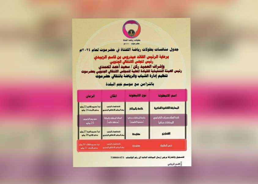 أعلنت إدارة الشباب والرياضة بانتقالي حضرموت عن تنظيم بطولات رياضية للفتيات في مدينة المكلا، وذلك خلال الفترة من 22 إلى 30 يوليو 2024، تزامناً مع موسم نجم البلدة. وتشمل البطولات مسابقة ثقافية فكرية، وكرة السلة، وسباق الكراسي المتحركة للمعاقات حركياً، والشطرنج، وتنس الطاولة. وأكدت إدارة الشباب ان البطولات ستقام في أماكن مغلقة خاصة، وتحكيم وتنظيم نسوي. فمن وجدت لديهن الرغبة بالتسجيل بالبطولة التواصل عبر الرقم 730664473 ويننشر كريتر نيوز "جول ومواعيد البطولات" ؛ وهي : مسابقة ثقافية فكرية (22-24 يوليو) كرة السلة وسباق الكراسي المتحركة للمعاقات حركياً (25 يوليو) الشطرنج (27-29 يوليو) تنس الطاولة (30 يوليو)