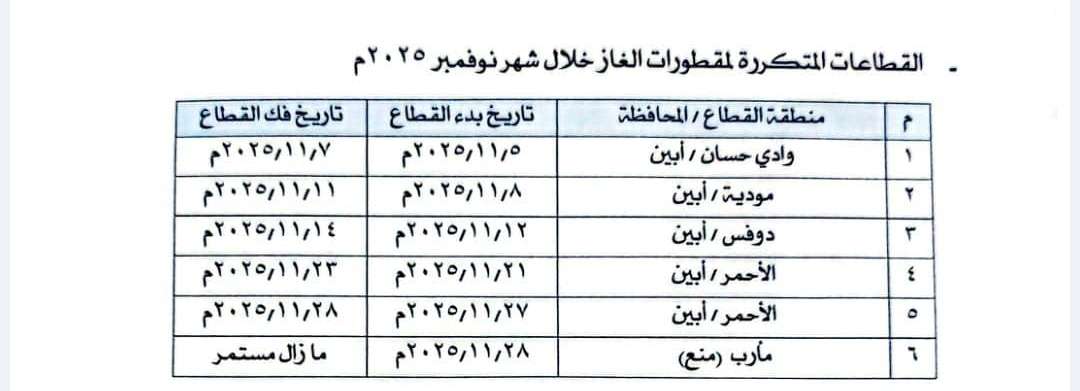 صرّح مصدر مسؤول في الشركة اليمنية للغاز أن الأزمة الراهنة في عدم توفر الغاز في العاصمة عدن تعود بشكل أساسي إلى القطاعات القبلية المتكررة في محافظتي مأرب وأبين، وفي المواقع المحددة بالجدول المرفق، والتي تسبب خلال الشهر الماضي في تعطيل حركة قاطرات الغاز وتقييد وصول الإمدادات إلى عدن و المحافظات المجاورة. وأوضح المصدر أن القطاع القبلي الأخير في محيط منشأة صافر بمحافظة مأرب، تسبب في منع دخول أو خروج القاطرات من مأرب، مما انعكس مباشرة على الكميات الواصلة إلى عدن وأدى إلى اضطراب السوق بشكل واضح. وأكد أن الشركة اليمنية للغاز وقيادة السلطة المحلية في عدن تتابع هذه المستجدات مع الجهات الأمنية لمعالجة المشكلة، لافتا إلى أن القطاعات القبلية باتت أكبر تحدٍّ لعملية الإمداد والنقل، وأن الشركة تعمل بشكل مكثف للحفاظ على الحد الأدنى من الاستقرار رغم الظروف الخارجة عن إرادتها، حيث إن العاصمة عدن تتأثر بشكل سريع عن باقي المحافظات نظرا للاستهلاك الكبير للغاز. كما اوضح المصدر أنه تم تخفيض مقطورات المحطات المركزية ومؤسسات كبار المستهلكين إلى نحو 40% من المخصص الشهري . وشدد المصدر على أنه في حال رفع القطاع القبلي في مأرب حاليا، ستستعيد السوق في عدن استقرارها تدريجيًا، إذ ستستأنف القاطرات حركتها الطبيعية، ما سينعكس على وفرة المادة خلال أيام قليلة.