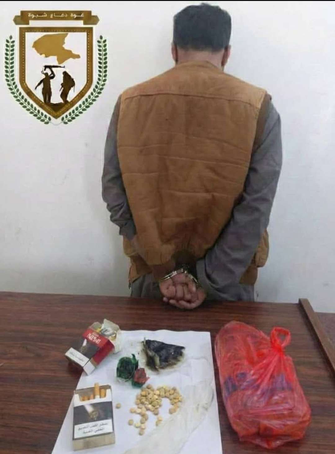 تمكنت إحدى الدوريات الأمنية التابعة للواء الثاني دفاع شبوة، اليوم، من تنفيذ عملية ضبط ناجحة للمدعو (ع.ن.م.س.ا) على أطراف مدينة عتق، مركز المحافظة، وبحوزته كمية متنوعه من الممنوعات منها الحبوب المخدرة والحشيش وشراب الخمر حيث تم توقيف المتهم وتحريز كافة المضبوطات، ويجري حالياً استكمال الإجراءات القانونية الأولية تمهيداً لإحالته مع ملف القضية إلى الجهات الأمنية والقضائية المختصة لإتخاذ الاجراءات القانونية بحقه وتأتي هذه العملية لتؤكد اليقظة العالية لأبطال قوات دفاع شبوة، وإصرارهم على مكافحة انتشار المخدرات والممنوعات التي تهدد أمن وسلامة المجتمع . #قوات_دفاع_شبوة