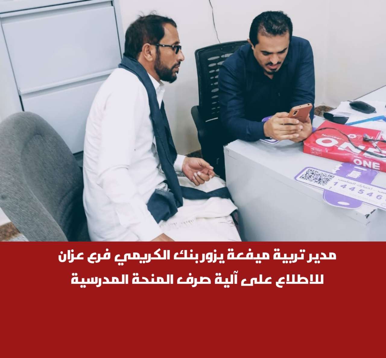 مدير تربية ميفعة يزور بنك الكريمي فرع عزان للاطلاع على آلية صرف المنحة المدرسية.