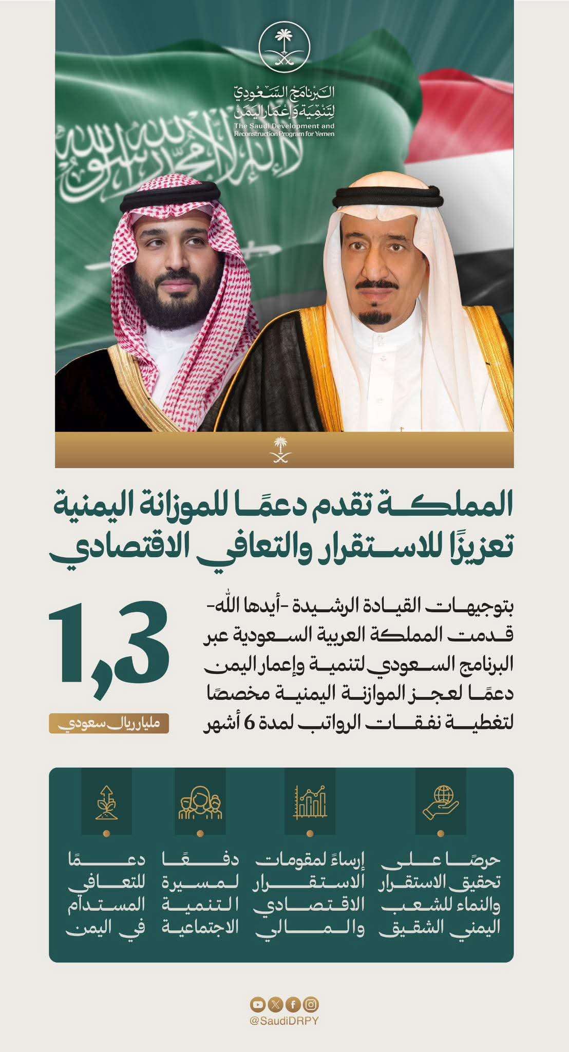 تنفيذاً لتوجيهات القيادة الرشيدة في المملكة العربية السعودية -حفظها الله-، وفي إطار الدعم المستمر للأشقاء في الجمهورية اليمنية، أعلنت المملكة عبر البرنامج السعودي لتنمية وإعمار اليمن عن تقديم دعم مالي جديد بمبلغ 1.3 مليار ريال سعودي. ويأتي هذا الدعم استجابةً للاحتياج العاجل لدعم الحكومة اليمنية في مواجهة عجز الموازنة العامة، وتحديداً لتغطية بند الرواتب، بما يضمن انتظام صرفها للموظفين. ويهدف هذا التدخل السريع إلى تعزيز الاستقرار الاقتصادي، وتحسين إدارة السياسة المالية، وضمان تدفق السيولة النقدية للحكومة اليمنية للقيام بواجباتها تجاه المواطنين في مختلف المحافظات. ويُعد هذا الدعم امتداداً لسلسلة من المبادرات التنموية والاقتصادية التي تقودها المملكة لدعم استقرار اليمن وتحسين الظروف المعيشية للشعب اليمني الشقيق.