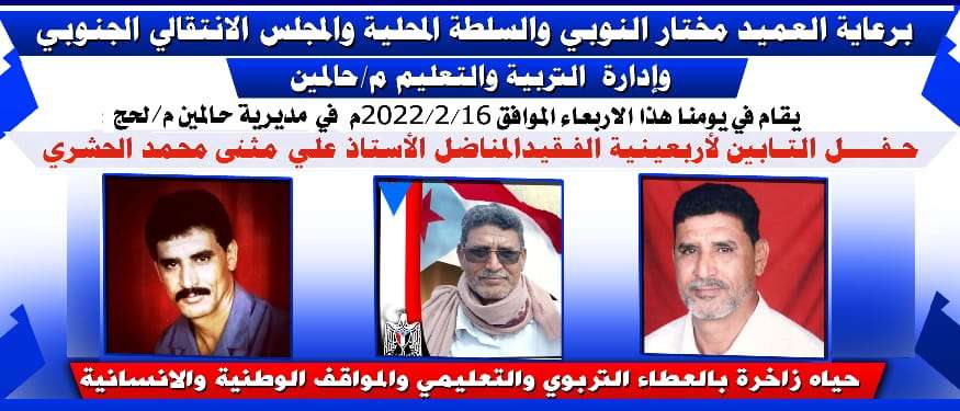 تشهد مديرية حالمين بلحج صباح الأربعاء القادم في المجمع التربوي حبيل الريدة حفل تأبين لأربعينية فقيد الوطن الأستاذ علي مثنى الحشري تقديراً لما قام به الفقيد الحشري من جهود وتفاني أثناء حياته وعمله الدؤوب في السلك التربوي والوطني . وتجري هذه الأيام تحضيرات وترتيبات واسعة من قبل اللجنة التحضيرية لإحياء الأربعينية وإنجاحها بصورة مميزة تليق بشخصية فقيد التربية والتعليم الأستاذ علي مثنى الحشري وماقدمه من خدمات جليلة لـردفان والجنوب العزيز أرضًا وإنسانًـا .." وتأتي أربعينية الفقيد التربوي الأستاذ علي مثنى الحشري برعاية العميد مختار النوبي والقيادة المحلية ممثلةً بـ المناضل عبدالفتاح حسين حيدرة وقيادة المجلس الانتقالي ممثلةً بـ العميد ناجي عبداللّه الكربي ومكتب التربية والتعليم ممثلةً بـ الأستاذ عبدالحكيم صالح ناصر وفاءً لتلك المحطات النضالية والوطنية المشرفة لرائد من رواد التعليم على مستوى ردفان والجنوب . هذا وستشهد الأربعينية حضور كبير ومشرف وقيادات عسكرية وسياسية وإجتماعية وكوادر في السلك التربوي في رباعيات ردفــان وكذلك ضيوف شرف من محافظة لحج وعدن وهي دعوة لكافة شرائح المجتمع للمشاركة في هذه الأربعينية العزيزة على قلوبنا وإنجاحها بالصورة المطلوبة