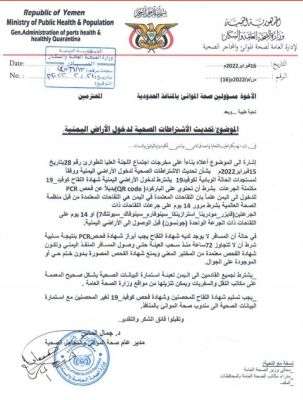 اصدرت السلطات في وزارة الصحة اشتراطات جديدة للقادمين الى اليمن ونصت الاشتراطات على عدد من الشروط على النحو الاتي: