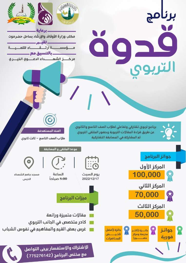 تستعد مؤسسة ارتقاء للتنمية لإقامة البرنامج التربوي التشاركي التفاعلي لطلاب الصف التاسع والثانوي، مطلع الأسبوع القادم بمدينة المكلا، ضمن برنامج (قدوة التربوي)، بالتنسيق مع مركز الشهداء الدعوي الخيري، برعاية مكتب الأوقاف والإرشاد بساحل حضرموت. وسيشمل البرنامج التربوي محاضرات تربوية عبر كادر متخصص في الجانب التربوي، والذي سيغرس القيم والمفاهيم الحميدة، بمشاركة كلاً من الشيخ يوسف بن أحمد المحمدي والشيخ عدنان بن حسن بن عمرو والشيخ الدكتور رشيد بن صالح بامعس. البرنامج سيتخلله مسابقات وجوائز يحصد المركز الأول فيها 100 ألف ريال يمني، والمركز الثاني 70 ألف ريال يمني، والمركز الثالث 50 ألف ريال يمني، وكذا جوائز فورية، وجائزة لأفضل تلخيص للمحاضرات، وجائزة لأكثر مدرسة أو مركز حضوراً للملتقى. البرنامج سينفذ يوم السبت المقبل الموافق 17 ديسمبر 2022م، بمسجد جامع الشهداء مدينة المكلا – محافظة حضرموت من الساعة 8:00 صباحاً إلى الساعة 12:00 ظهرًا.