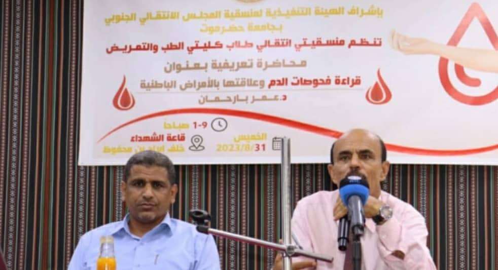 منسقية الانتقالي بجامعة حضرموت تنظم محاضرة عن “مهارات قراءة فحوصات الدم وعلاقتها بالأمراض الباطنية”
