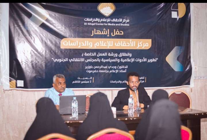 أقيم بمدينة المكلا، حفل إشهار مركز الأحقاف للإعلام والدراسات، بحضور عدد من السياسيين والإعلاميين الجنوبيين. معلنين بذلك؛ بدء تقديم الخدمات المعرفية والبحثية والإعلامية التي سيتبناها المركز للمجتمع المحلي والدولي، ضمن نطاق عمله في المحافظات الجنوبية. وأوضح المدير التنفيذي للمركز، الصحفي أحمد الجعيدي؛ أن المركز سيعمل على توجيه الرأي العام المحلي، عبر أدواته الإعلامية، للدفع بعملية البناء والتنمية، كذلك رفع مستوى الوعي لدى المجتمع، وتأهيل شريحة الشباب، في مجال الإعلام، وتمكينهم سياسياً، من خلال تقديم الدعم المعرفي اللازم لهم، وتقديم الاستشارات المناسبة، والدفع بهم لتصدر المجالات المجتمية. كما انطلقت كذلك اليوم؛ ورشة العمل الخاصة بتطوير الأدوات الإعلامية والسياسية بالمجلس الانتقالي الجنوبي، وسط مشاركة ٣٥ سياسي وإعلامي جنوبي، خُطت خلالها ورقة عمل قدمها وأدارها أستاذ الإعلام بجامعة حضرموت الدكتور وجدي عبدالرحمن باوزير. وتطرقت ورشة العمل كذلك؛ لسُبل تحسين الأداء العام للإعلام الجنوبي، والخطوات التصحيحية التي يجب اتباعها للنهوض بأداء هذه الأدوات. كذلك ناقشت الورشة؛ ماذا ينتظر من الأدوات الإعلامية والسياسية في المستقبل لدعم قضية شعب الجنوب؟ ووضعت جُملة من التوصيات ليتبناها المركز، ويوصلها للجهات المعنية داخل المجلس الانتقالي الجنوبي، بصفته الحامل السياسي المعترف به محلياً ودولياً للقضية الجنوبية.