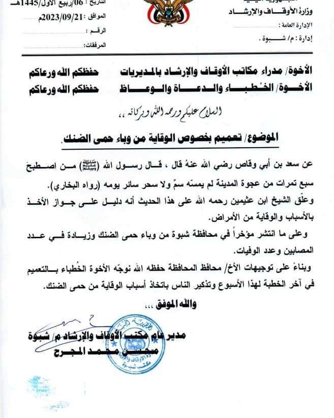 في إطار التنسيق بين جميع اجهزة السلطة المحلية لمواجهة وباء حمى الضنك، وبناء على توجيهات المحافظ الشيخ عوض محمد ابن الوزير، اصدر اليوم مدير عام مكتب الأوقاف والإرشاد بالمحافظة الاستاذ محسن محمد المجرح تعميمآ عاما لجميع مكاتب الأوقاف والإرشاد بالمديريات وعبرها لجميع خطباء المساجد بالمحافظة، دعاهم فيه بضرورة الإسهام في الحملة التوعوية للوقاية من انتشار وباء حمى الضنك، وذلك بتخصيص جزء من خطبة الجمعة يوم غد لتذكير عامة مواطني المحافظة باتخاذ الاسباب للوقاية من وباء حمى الضنك، والذي تفشى مؤخرا في كثير من مناطق المحافظة وأدى الى عدد من الوفيات. وهذا نص التعميم : الأخوة/ مدراء مكاتب الأوقاف والإرشاد بالمديريات، الأخوة/ الخطباء والوعاظ، حفظكم الله . السلام وعليكم ورحمه الله وبركاته, الموضوع/ تعميم بخصوص الوقاية من وباء حمى الضنك، عن سعد بن وقاص رضى الله عنه قال رسول الله صل الله عليه وسلم، من اصطبح سبع تمرات من عجوة المدينة لم يمسه سًم ولا سحر سائر يومه ( رواة البخاري )، وعلق الشيخ ابن عثيمين رحمه الله على هذا الحديث أنه دليل على جواز الأخذ بالاسباب والوقاية من الامراض، وعلى ما انتشر مؤخرآ في محافظة شبوة من وباء حمى الضنك وزيادة في عدد المصابين وعدد الوفيات، وبناء على توجيهات الاخ/ محافظ المحافظة حفظه الله نوجُه الأخوة الخُطباء بالتعميم في آخر الخطبة لهذا الاسبوع وتذكير الناس باتخاذ اسباب الوقاية من حمى الضنك ، والله الموفق مدير عام مكتب الأوقاف والإرشاد م شبوة محسن محمد المجرح