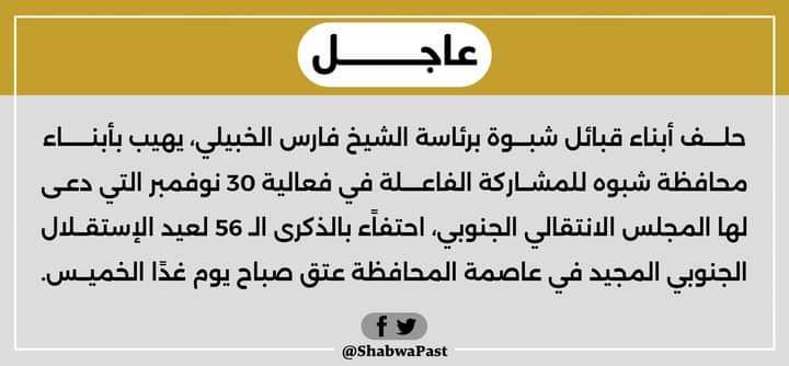 حلف ابناء قبائل شبوة برئاسة الشيخ فارس الخبيلي، يهيب بأبناء محافظة شبوه للمشاركة الفاعلة في فعالية 30 نوفمبر التي دعا لها المجلس الانتقالي الجنوبي، احتفاءً بالذكرى الـ 56 لعيد الاستقلال الجنوبي المجيد في عاصمة المحافظة عتق صباح يوم غداً الخميس. #موعدنا_فعاليه_عتق_30نوفمبر
