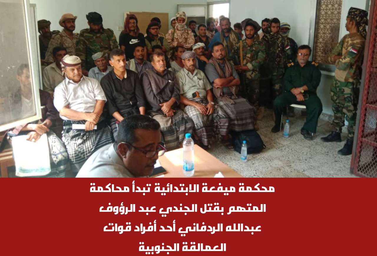 محكمة ميفعة الابتدائية تبدأ محاكمة المتهم بقتل الجندي عبد الرؤوف عبدالله الردفاني أحد أفراد قوات العمالقة الجنوبية