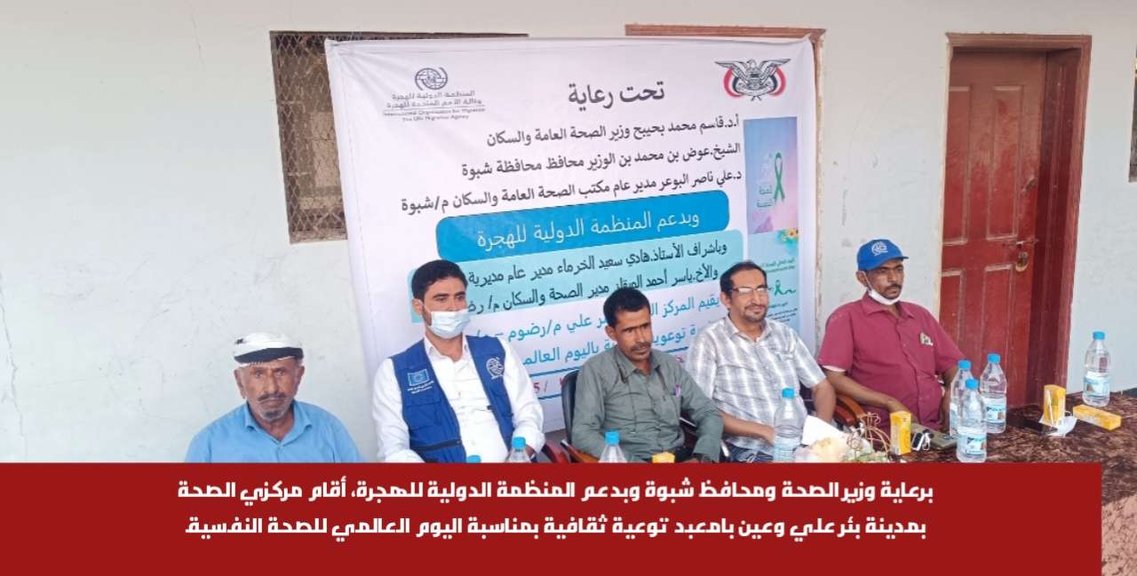 برعاية وزير الصحة ومحافظ شبوة وبدعم المنظمة الدولية للهجرة، أقام مركزي الصحة بمدينة بئر علي وعين بامعبد توعية ثقافية بمناسبة اليوم العالمي للصحة النفسية
