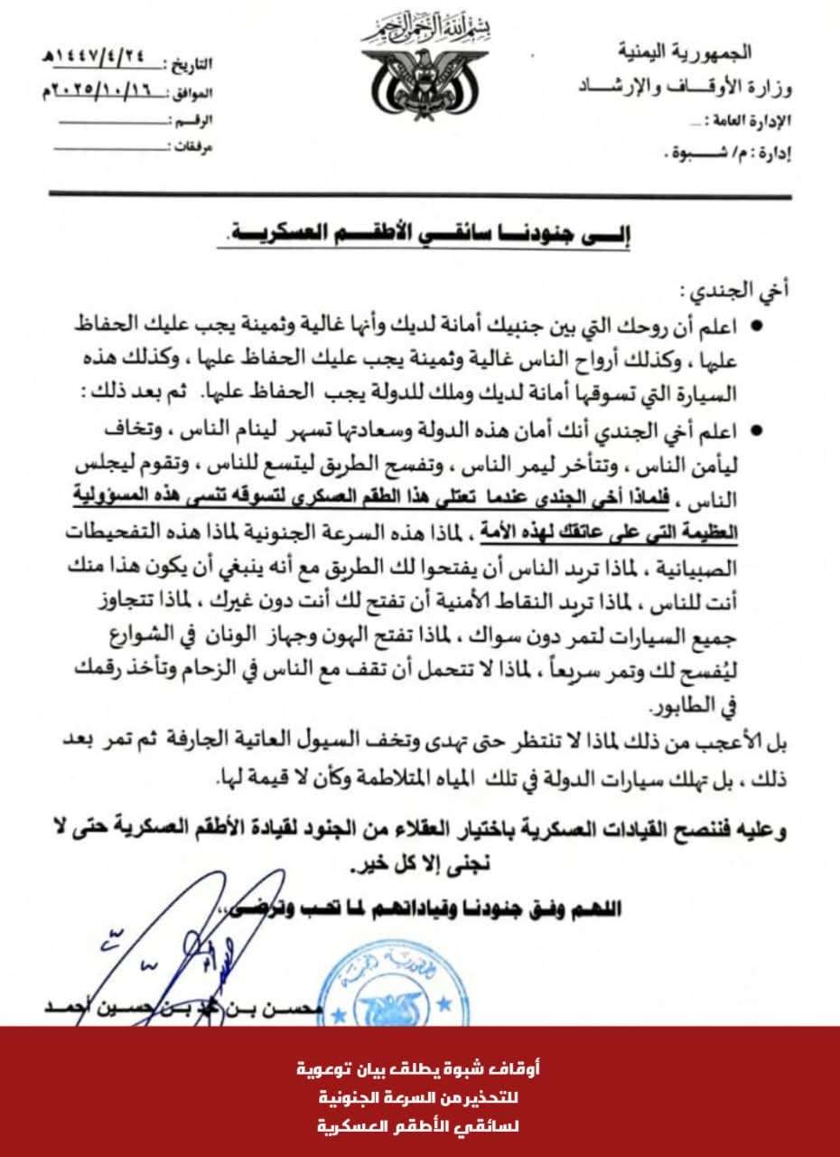 أوقاف شبوة يطلق بيان توعوية للتحذير من السرعة الجنونية لسائقي الأطقم العسكرية
