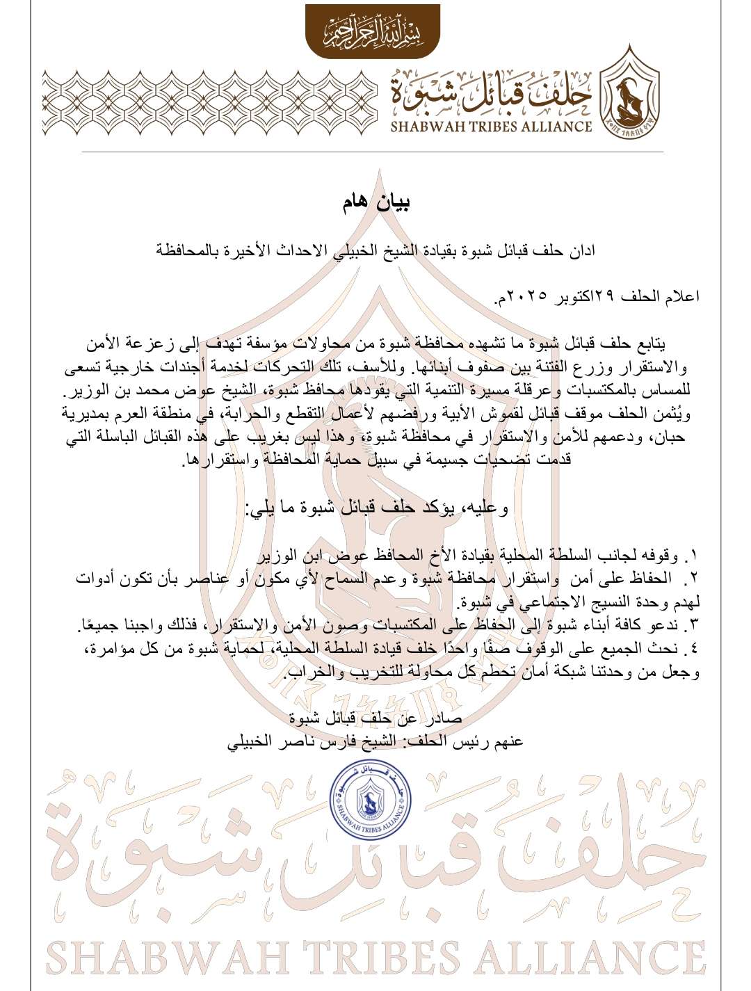إعلام حلف قبائل شبوة 29-10-2025 يتابع حلف قبائل شبوة ما تشهده محافظة شبوة من محاولات خبيثة تهدف إلى زعزعة الأمن والاستقرار وزرع الفتنة بين صفوف أبنائها. وللأسف، يقود هذه التحركات أدوات من داخل المحافظة لخدمة أجندات خارجية تسعى للمساس بالمكتسبات وعرقلة مسيرة التنمية التي يقودها محافظ شبوة، الشيخ عوض محمد بن الوزير. ويُثمن الحلف موقف قبائل لقموش الأبية ورفضهم لأعمال التقطع والحرابة في منطقة العرم بمديرية حبان، ودعمهم للأمن والاستقرار في محافظة شبوة، وهذا ليس بغريب على هذه القبائل الباسلة التي قدمت تضحيات جسيمة في سبيل حماية المحافظة واستقرارها. وعليه، يؤكد حلف قبائل شبوة ما يلي: 1. أمن المحافظة واستقرارها خط أحمر، ولن نسمح لأي مكون أو عناصر بأن تكون أدوات لهدم وحدة النسيج الاجتماعي في شبوة. 2. ندعو كافة قبائل وأبناء شبوة إلى الحفاظ على المكتسبات وصون الأمن والاستقرار، فذلك واجبنا جميعًا. 3. نؤكد أن كل محاولة لإثارة الفتنة أو تعطيل التنمية ستصطدم بإرادة أبناء شبوة وعزم قبائلها الأبية. 4. نحث الجميع على الوقوف صفًا واحدًا خلف قيادة السلطة المحلية ممثلة بالمحافظ الشيخ عوض بن محمد بن الوزير لحماية شبوة من كل مؤامرة، وجعل من وحدتنا شبكة أمان تتحطم عليها كل محاولة للتخريب وإقلاق السكينة العامة وخرق النسيج الاجتماعي. صادر عن حلف قبائل شبوة عنهم رئيس الحلف: الشيخ فارس ناصر الخبيلي التاريخ: 29 أكتوبر 2025م