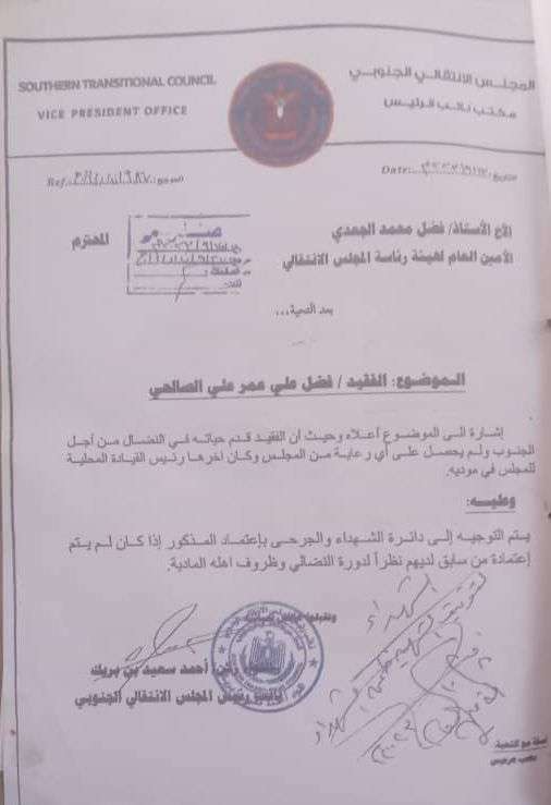 عائلة الفقيد فضل علي الصالحي تناشد رئيس المجلس الانتقالي الجنوبي بصرف مرتباته المتوقفة