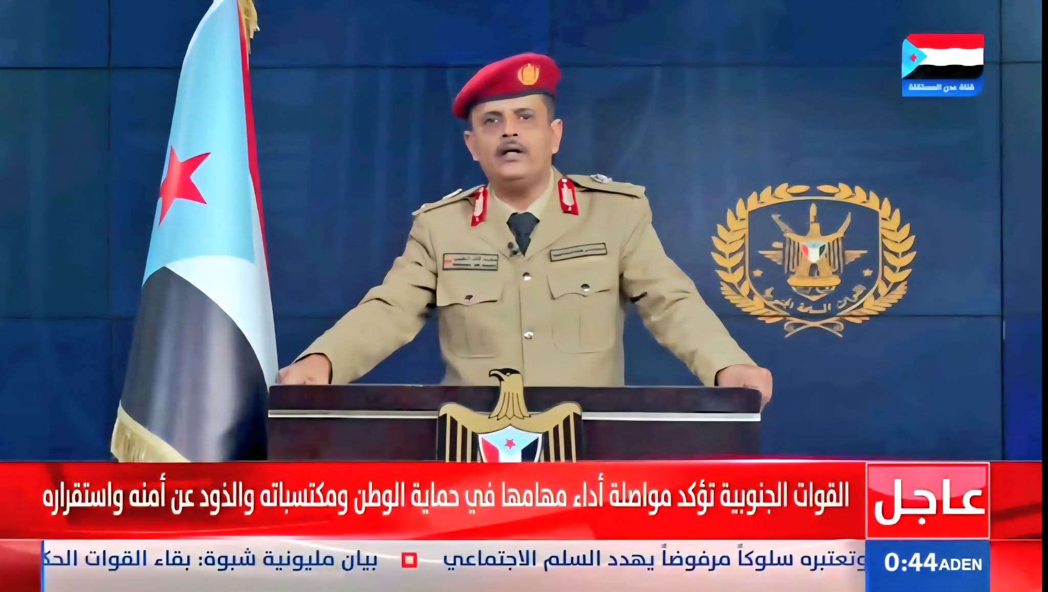 يا أبناء شعبنا في الداخل والخارج اننا وإذ ننفي ما يروج له الإعلام المعادي من اشاعات زائفة لنؤكد ثبات قواتكم المسلحة على كافة مسرح "عملية المستقبل الواعد" في حضرموت والمهرة واستكمال كافة أهدافها في قطع شرايين تهريب السلاح للمليشيات الحوثية ودك أوكار التنظيمات الإرهابية واسقاط مظلتها الإخوانية ووقف العبث والاستنزاف لثروات شعبنا في حضرموت. يا أبناء شعبنا الجنوبي العظيم نود في هذا البيان توضيح ما يلي: • إن أبنائكم وإخوانكم أبطال قواتنا المسلحة يواصلون أداء مهامهم في حماية الوطن ومكتسباته والذود عن أمنه واستقراره والاضطلاع بدورهم كشريك فاعل في تعزيز استقرار المنطقة والأمن والسلم الدوليين . • إنه وانطلاقا من حرصنا على إنجاح جهود الأشقاء في التحالف، وبما يحفظ المكتسبات المحققة لتأمين كامل تراب وطننا الجنوبي العزيز فقد بدأت اليوم عملية إشراك زملائنا الجنوبيين في قوات درع الوطن الجنوبية للاضطلاع بالمسؤوليات والمهام الملقاة على عاتق قواتنا المسلحة جنباً الى جنب مع إخوانهم من منتسبي كافة تشكيلات قواتنا المسلحة الجنوبية. • وبناءً على ذلك فقد أعيد اليوم تموضع اللواء الأول درع وطن في منطقة ثمود وسيعقبه إعادة تموضع وحدات أخرى من قوات درع الوطن في منطقة رماة ومناطق أخرى في محافظتي حضرموت والمهرة وفقاً لما تم الاتفاق عليه، وبما يضمن أن قواتنا المسلحة الجنوبية بكافة قطاعاتها قد أمّنت كافة أراضينا. تؤكد قواتكم المسلحة الجنوبية أن هذا التنظيم والانتشار يأتي وفق توجيهات قيادتنا السياسية العليا ممثلة بالرئيس القائد عيدروس الزُبيدي رئيس المجلس الانتقالي الجنوبي القائد الأعلى للقوات المسلحة الجنوبية وفي سياق حرصنا على التعاطي مع الجهود المشكورة للأشقاء في التحالف، وبما يضمن أمن وسلامة ووحدة الجنوب عامة وحضرموت والمهرة خاصة. الرحمة والخلود للشهداء الأبرار الشفاء العاجل للجرحى المجد لوطننا الجنوب العربي الشموخ لشعبه وقواته المسلحة والسلام عليكم ورحمة الله وبركاته العاصمة عدن 1 يناير 2026م