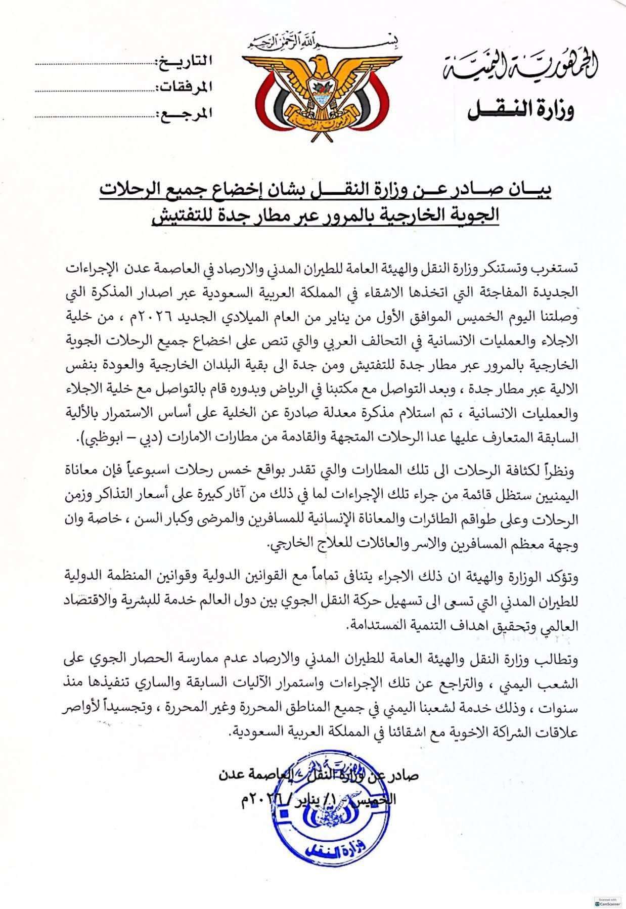 تستغرب وتستنكر وزارة النقل والهيئة العامة للطيران المدني والأرصاد في العاصمة عدن، الإجراءات الجديدة المفاجئة التي اتخذها الأشقاء في المملكة العربية السعوية عبر إصدار المذكرة التي وصلتنا اليوم الخميس الموافق الأول من يناير من العام الميلادي الجديد ٢٠٢٦م، من خلية الإجلاء والعمليات الإنسانية في التحالف العربي، والتي تنص على إخضاع جميع الرحلات الجوية الخارجية بالمرور عبر مطار جدة للتفتيش، ومن جدة إلى بقية البلدان الخارجية والعودة بنفس الآلية عبر مطار جدة.. وبعد التواصل مع مكتبنا في الرياض، وبدوره قام بالتواصل مع خلية الإجلاء والعمليات الإنسانية، تم استلام مذكرة معدلة صادرة عن الخلية على أساس الاستمرار بالآلية السابقة المتعارف عليها عدا الرحلات المتجهة والقادمة من مطارات الإمارات (دبي - أبوظبي). ونظراً لكثافة الرحلات إلى تلك المطارات والتي تقدر بواقع خمس رحلات أسبوعياً، فإن معاناة اليمنيين ستظل قائمة من جراء تلك الإجراءات، لما في ذلك من آثار كبيرة على أسعار التذاكر وزمن الرحلات وعلى طواقم الطائرات، والمعاناة الإنسانية للمسافرين والمرضى وكبار السن، خاصة إن وجهة معظم المسافرين والأسر والعائلات للعلاج الخارجي. وتؤكد الوزارة والهيئة إن ذلك الإجراء يتنافى تماماً مع القوانين الدولية وقوانين المنظمة الدولية للطيران المدني، التي تسعى إلى تسهيل حركة النقل الجوي بين دول العالم خدمة للبشرية والاقتصاد العالمي وتحقيق أهداف التنمية المستدامة. وتطالب الوزارة وهيئة الطيران بعدم ممارسة الحصار الجوي على الشعب اليمني، والتراجع عن تلك الإجراءات واستمرار الآليات السابقة والساري تنفيذها منذ سنوات، وذلك خدمة لشعبنا اليمني في جميع المناطق المحررة وغير المحررة وتجسيداً لأواصر علاقات الشراكة الأخوية مع أشقائنا في المملكة العربية السعوية. صادر عن وزارة النقل - العاصمة عدن الخميس ١/ يناير/ ٢٠٢٦م