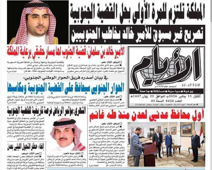 نشرت صحيفة "الأيام" في عددها الصادر اليوم خبراً بارزاً حول تصريحات سمو الأمير خالد بن سلمان، وزير الدفاع السعودي، بخصوص القضية الجنوبية. أهم النقاط التي ذكرها الخبر: * تأكيد سموه أن قضية الجنوب لها "مسار حقيقي" يحظى برعاية مباشرة من المملكة العربية السعودية. * الالتزام بوضع حل للقضية الجنوبية ضمن إطار سياسي شامل. * الإشادة بدور وشجاعة القيادات الجنوبية في هذه المرحلة الحساسة. يعتبر هذا التصريح خطوة هامة في مسار الجهود السياسية لتحقيق الاستقرار والوصول إلى حلول عادلة تلبي تطلعات الشعب. #خالد_بن_سلمان #القضية_الجنوبية #عدن #السعودية #صحيفة_الأيام