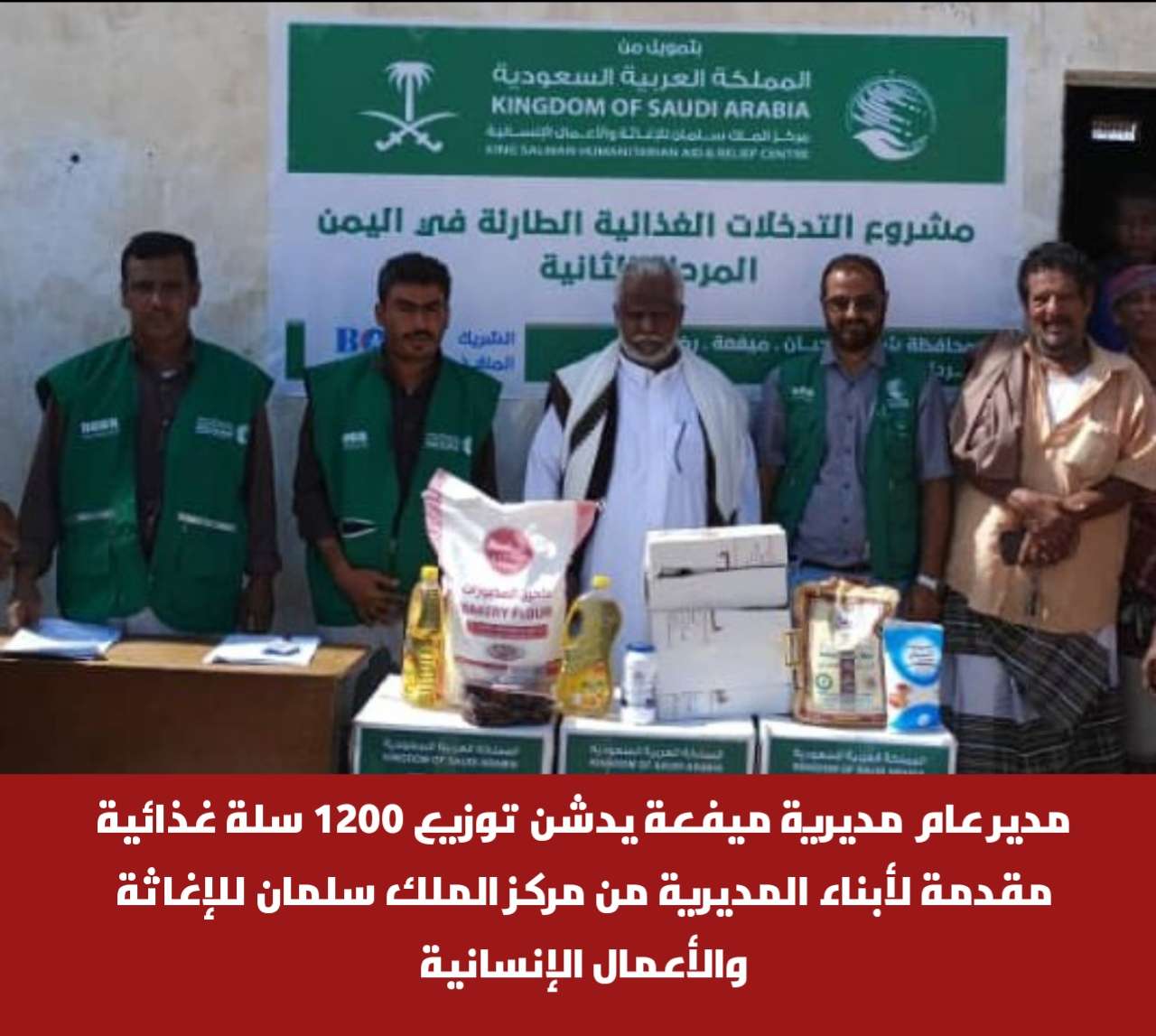 مدير عام مديرية ميفعة يدشن توزيع 1200 سلة غذائية مقدمة لأبناء المديرية من مركز الملك سلمان للإغاثة والأعمال الإنسانية