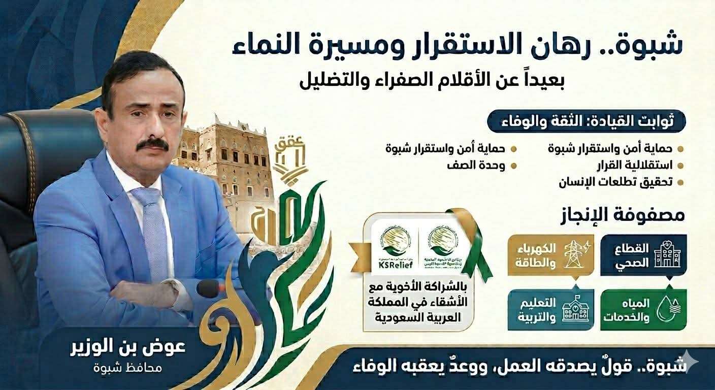 . في الوقت الذي تحاول فيه بعض الأقلام الحاقدة نسج روايات مضللة وبثّ الشائعات المغرضة، تمضي محافظة شبوة بثبات وثقة على طريق الأمن والاستقرار، مستندةً إلى واقعٍ ملموسٍ يلمسه المواطن في تفاصيل حياته اليومية، لا إلى أوهامٍ تُصاغ في غرف التضليل. ف #محافظة_شبوة اليوم ليست مجرد عنوانٍ إعلامي، بل نموذجٌ حيّ لبيئةٍ آمنةٍ مستقرة، تتعزز فيها مؤسسات الدولة وتترسخ فيها دعائم التنمية. لقد جاءت الجهود التي يقودها محافظ المحافظة، عوض بن الوزير، بالتنسيق مع الأشقاء في #التحالف_العربي ، ممثلة #المملكة_العربية_السعودية ثمرة رؤية استراتيجية ناضجة، قامت على أسس متينة من الشراكة الصادقة والمسؤولية المشتركة، بعيداً عن أي حسابات ضيقة. رؤيةٌ وضعت في مقدمة أولوياتها: * ترسيخ #الأمن والاستقرار كقاعدة صلبة لكل مسار تنموي. * تعزيز وحدة الصف الشبواني وصون النسيج الاجتماعي. * الدفع بعجلة #التنمية نحو آفاق مستدامة تلبي تطلعات المواطن. وبفضل هذه المقاربة الواقعية، استطاعت شبوة أن تفرض حضورها كشريك موثوق يحظى بالاحترام والتقدير، حيث انعكس ذلك في الاستجابة الفاعلة لمتطلبات المحافظة، واستمرار تقديم الدعم بما يضمن استقرار الخدمات الحيوية وعدم تأثرها بأي ظروف طارئة. فالمؤسسات تعمل بكفاءة، والأجهزة الأمنية في أعلى درجات الجاهزية، فيما تتجه بوصلة العمل بثبات نحو البناء والتنمية. وعلى صعيد الخدمات، حظيت لقطاعات الأساسية أهتماما أكبر، حيث تركزت الجهود على: * القطاع الصحي: دعم وتشغيل المستشفيات والمرافق الصحية، بما يضمن تقديم خدمات طبية تليق بالمواطن. * التعليم: المضي في تنفيذ مشاريع البنية التحتية التعليمية. * تعزيز منظومة #الكهرباء عبر مشاريع استراتيجية، وفي مقدمتها المضئ في استكمال الإجراءات المتعلقة بتنفيذ محطات الطاقة الغازية الثلاث.. * #المياه والخدمات الأساسية: العمل المستمر على تحسين خدمات المياه وتلبية احتياجات المواطن اليومية كأولوية قصوى. * الطرقات: من خلال مشاريع ذات اولوية تسهم في ربط المديريات وتعزز الحركة الاقتصادية والخدمية في المحافظة. وقد جسّد الدعم الأخوي من المملكة العربية السعودية—عبر #مركز_الملك_سلمان_للإغاثة_والأعمال_الإنسانية و #البرنامج_السعودي_لتنمية_وإعمار_اليمن —نموذجاً للشراكة، القائمة على الاستجابة لاحتياجات الواقع، وترجمة ذلك إلى مشاريع وخدمات تلامس حياة المواطنين بشكل مباشر. ويستمر التنسيق المشترك بين قيادة #السلطة المحلية والاشقاء في #السعودية ، لإعداد وتنفيذ مصفوفة متكاملة للاحتياجات وفق خطط زمنية مدروسة، حيث تم استكمال عدد من المشاريع الحيوية، فيما يجري استكمال ما تبقى منها، ليتم الإعلان عنها تباعاً كإنجازات واقعية تعزز مسار التنمية، لا كوعود مؤجلة. ختاماً، تظل شبوة نموذجاً للأمن والاستقرار، وعنواناً لمسيرة تنموية متواصلة، عصيّة على محاولات التشويه والتضليل، بفضل وعي أبنائها وتكاتفهم، وحنكة قيادتها، وصلابة مؤسساتها.