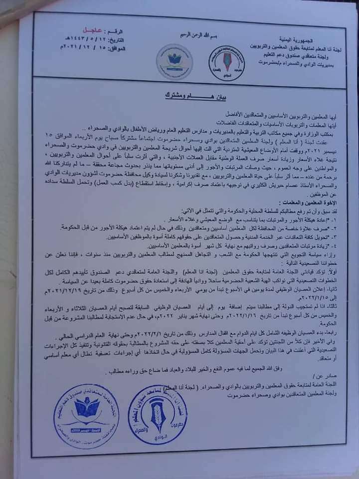 معلمو ومعلمات وادي حضرموت والصحراء يؤكدون تأييدهم لخطوات الهبة الشعبية ويعلنون عصيان وظيفي (بيان)