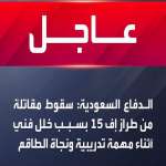 عاجل الدفاع السعودية: سقوط مقاتلة من طراز إف 15 بسبب خلل فني أثناء الدفاع السعودية: سقوط مقاتلة من طراز إف 15 بسبب خلل فني أثناء مهمة تدريبية ونجاة الطاقم