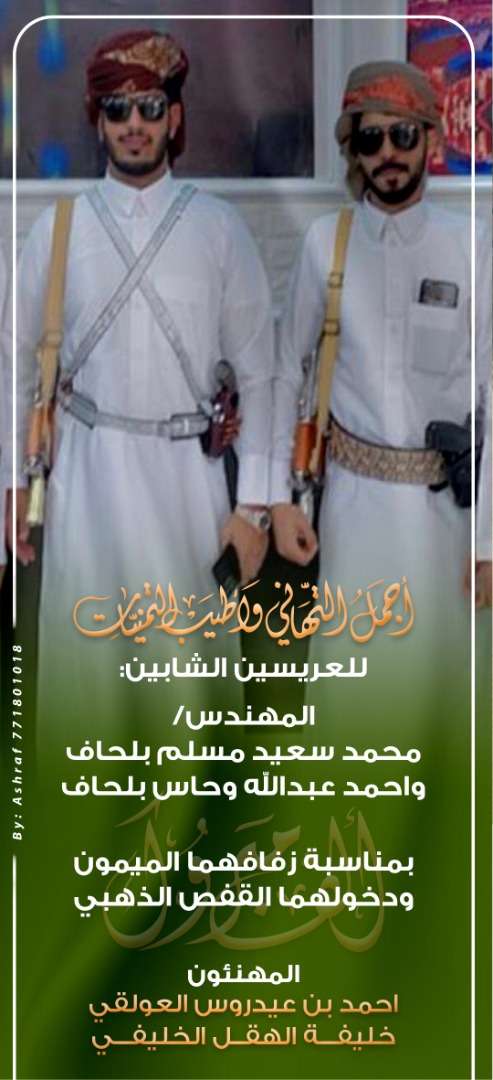 نتقدم بأسمى آيات التهاني والتبريكات للعريسين الشابين: - المهندس/ محمد سعيد مسلم بلحاف - احمد عبدالله وحاس بلحاف بمناسبة زفافهما الميمون ودخولهما القفص الذهبي، مساء الجمعة بمدينة الغيضة م/ المهرة. وبهذه المناسبة السعيدة نعبر عن أسمى آيات التهاني والتبريكات بمناسبة الزفاف واتمام مراسم الزواج متمنين لهما حياة سعيدة يملؤها الخير والسعادة والعافية، سائلين الله العلي القدير أن يتمم عليهما وأن يبارك لهما وأن يجمع بينهما وأزواجهم على الخير وأن يرزقهما الله الذرية الصالحة وبالرفاه والبنين ودامت دياركم آل بلحاف عامرة بالأفراح .. ونتمنى للعريسين حياة تملؤها السعادة والمحبة .. الف الف مبروك المهنئون/ احمد بن عيدروس العولقي خليفة الهقل الخليفي
