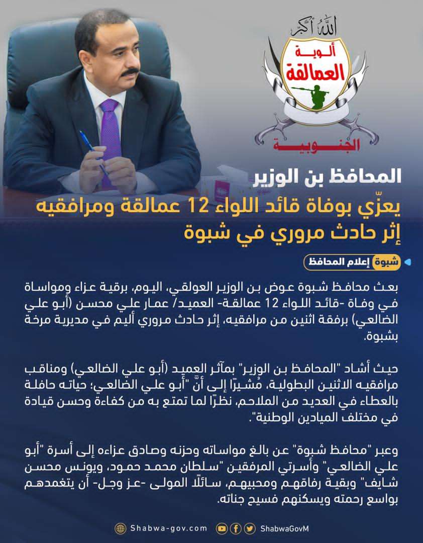 ابن الوزير يعزّي بوفاة قائد اللواء 12 عمالقة ومرافقيه إثر حادث مروري في شبوة