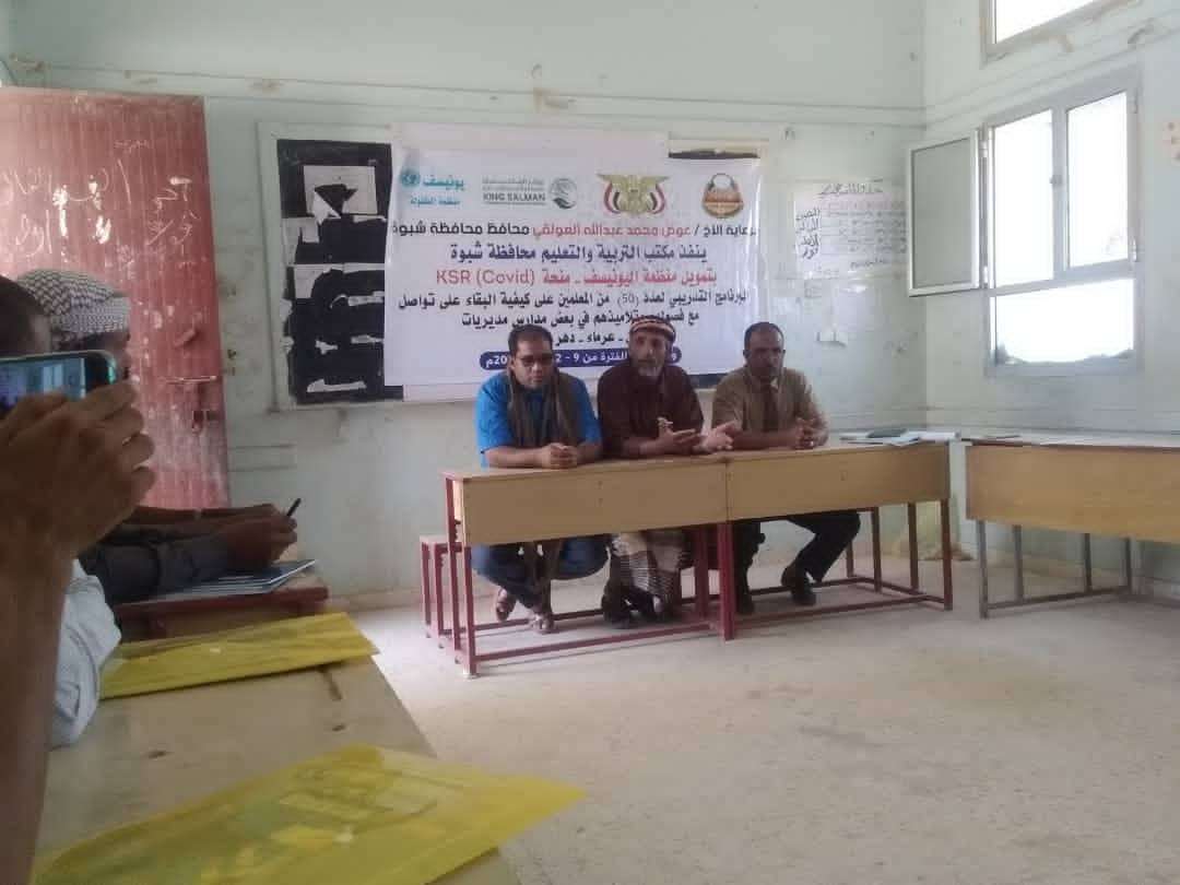 تربية شبوة يدشن البرنامج التدريبي لعدد 50 معلماً على كيفية البقاء على تواصل مع فصولهم وتلاميذهم بمديريات جردان - عرماء - دهر - الطلح*