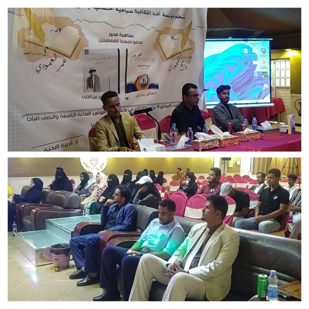 برعاية معالي وزير الدولة محافظ العاصمة عدن الأستاذ أحمد حامد لملس.. نظمت مؤسسة أمد الثقافية اليوم السبت، صباحية احتفائية وتكريمية للقاصين الأستاذ عمر محمد العمودي والاستاذ راجح المحوري، بقاعة منتج اللوتس بخورمكسر بالعاصمةعدن، بمناسبة صدور مجموعتيهما القصصيتين «إحساس مُحرّم» للقاص راجح المحوري و«لاجى لم يفر من الحرب» للقاص عمر العمودي. وفي الاحتفائية الصباحية التي تخللت كلمة لمكتب الثقافة بالعاصمةعدن، وتداخلات نقدية من قبل الدكتور شهاب القاضي، والدكتور عبدالحكيم باقيس، والدكتور أديبة البحري. وفي نهاية الاحتفائية الصباحية تم تكريم القاصين عمر العمودي وراجح المحوري بذرعان من مكتب الثقافة بالعاصمة عدن، وشهائد تقديرية مقدمة من مكتب إعلام محافظة أبين ومؤسسة أمد الثقافية. حضر الاحتفائية الأستاذة رندا عكبور مدير مكتب الثقافة بالعاصمة عدن، والدكتور ياسر باعزب مدير مكتب إعلام محافظة أبين.