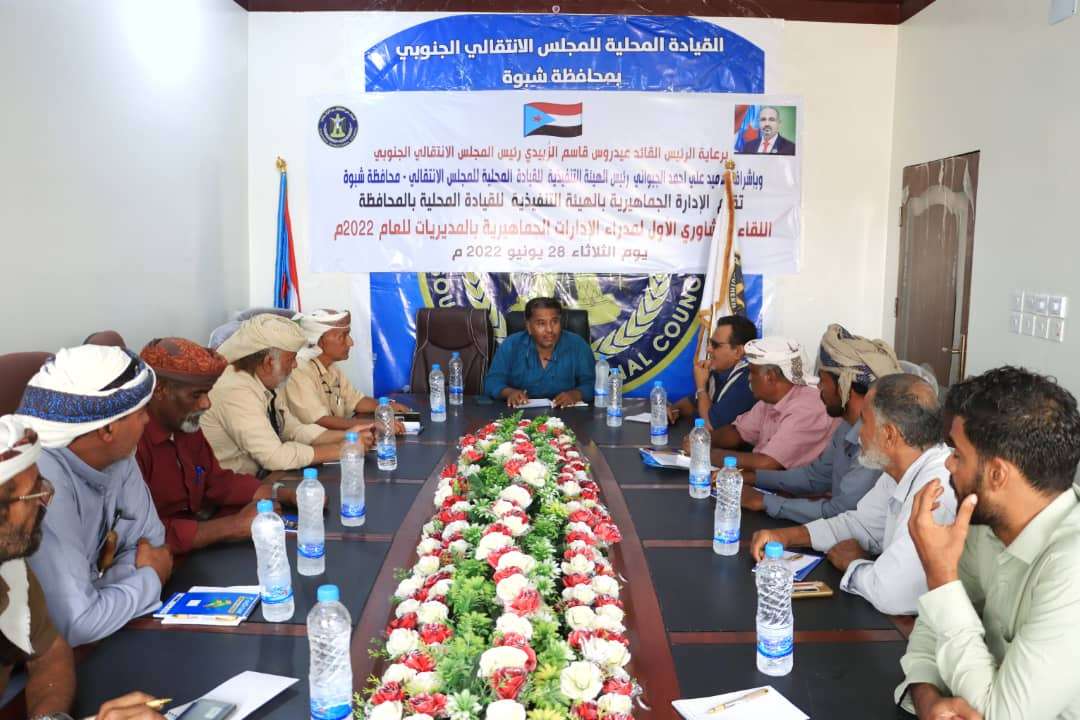 جماهيرية انتقالي شبوة تعقد لقاءً تشاورياً مع مدراء الإدارات الجماهيرية في المديريات.