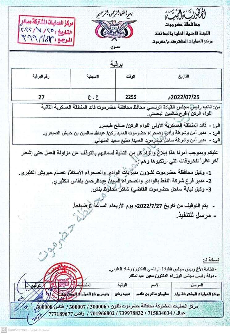 البحسني يوقف عدد من المسؤولين في حضرموت عن العمل حتى إشعار آخر.