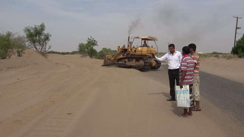 تواصل ازاحة الرمال المتحركة في خط مغرس ناجي بمديرية تبن لحج.