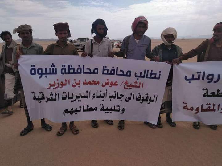 شهد مخيم على الخط الدولي في قرن الضبية بمحافظة شبوة اليوم الثلاثاء، وقفة سلمية لتوجيه عدة مطالب إلى الرئيس عيدروس الزبيدي رئيس المجلس الانتقالي الجنوبي. ودعوا إلى استمرار رواتب الشهداء المنقطعة من أفراد النخبة والمقاومة، ومنح المديريات الشرقية حقها بالمشاريع التنموية، وعودة اللواء السادس نخبة شبوانية. كما طالبوا بربط الكهرباء في المديريات الشرقيه بشركة العقله واعطاء أبناء المديريات الشرقيه الأولويات في العماله والمقاولات في الشركه