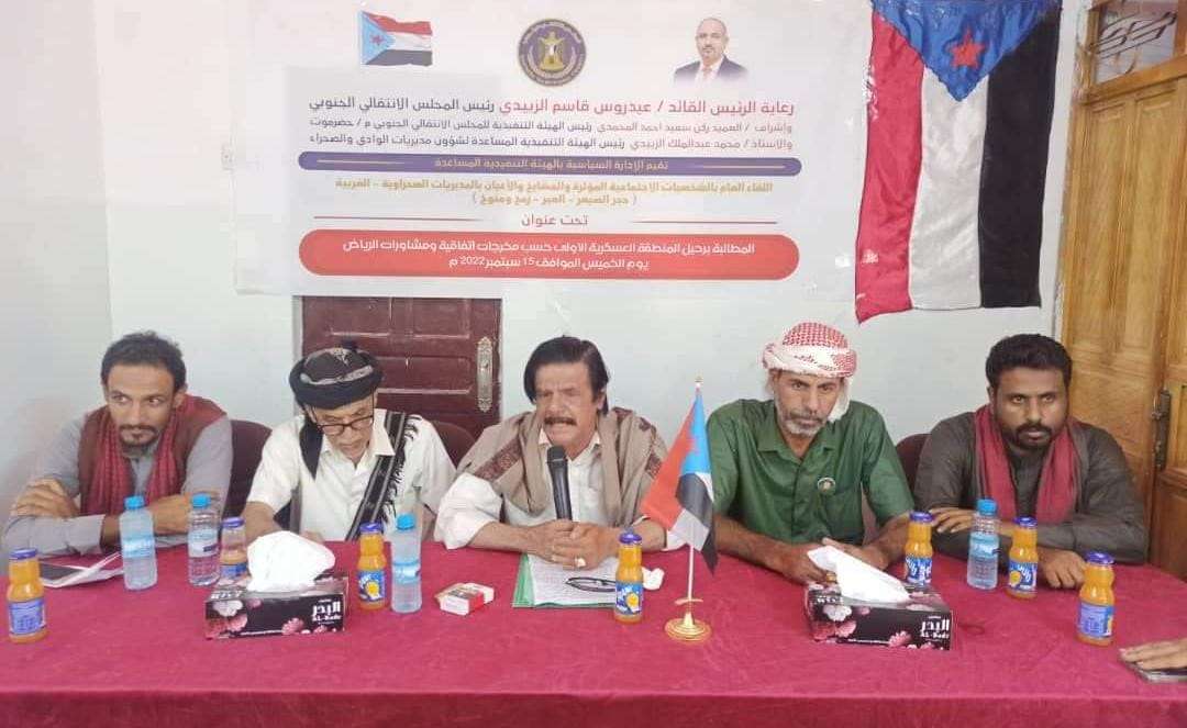 لقاء موسع للشخصيات الاجتماعية المؤثرة والمشائخ والأعيان بالمديريات الغربية الصحراوية للمطالبة بتنفيذ الشق العسكري لاتفاقية ومشاورات الرياض.