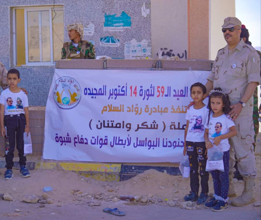 بمناسبة الذكرى 59 لعيد الثورة 14 أكتوبر المجيد روّاد السلام تنفذ حملة شكر وامتنان لقوات دفاع شبوة.