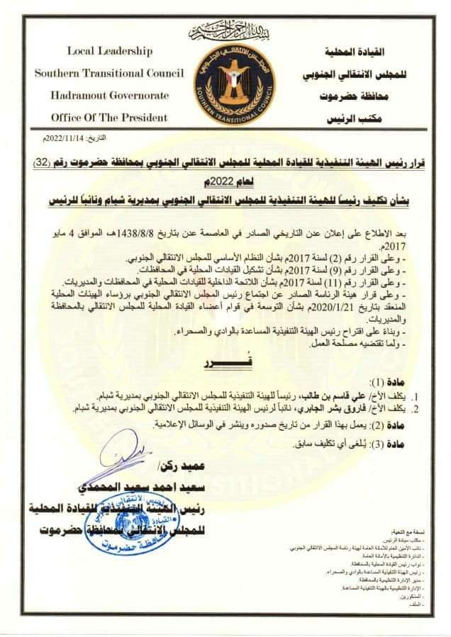 أصدر رئيس الهيئة التنفيذية للقيادة المحلية للمجلس الانتقالي الجنوبي بمحافظة حضرموت، العميد الركن سعيد أحمد المحمدي، اليوم الاثنين، وبناء على مقترح من رئيس الهيئة التنفيذية المساعدة بوادي حضرموت قراراً، قضى بعد الديباجة بتكليف الأستاذ علي قاسم بن طالب، رئيسا للهيئة التنفيذية للمجلس الانتقالي الجنوبي بمديرية شبام، وفاروق بشر الجابري، نائبا له. ونصت المادة الثانية من القرار بالعمل به من تاريخ صدوره ونشره في وسائل إعلام المجلس.