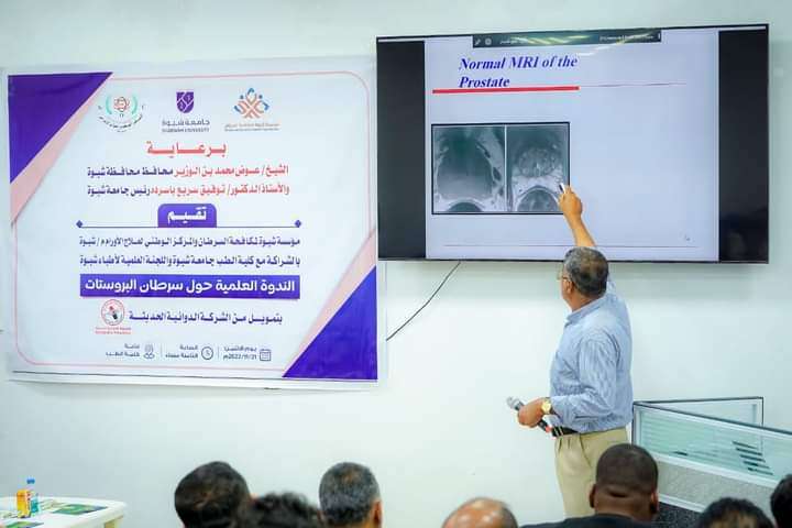 أقامت مؤسسة شبوة لمكافحة السرطان والمركز الوطني لعلاج الأورام بمحافظة شبوة ندوة علمية بالشراكة مع كلية الطب حول سرطان البروستات بتمويل من الشركة الدوائية الحديثة وبرعاية محافظ المحافظة عوض بن الوزير العولقي ورئيس جامعة شبوة الأستاذ الدكتور توفيق سريع باسردة. وخلال الندوة رحب الدكتور أحمد امصبح أمين عام الجامعة وعميد كلية الطب الدكتور علي عوض حبتور بإقامة مؤسسة شبوة لمكافحة السرطان هذه الندوة العلمية في الكلية. وتطرق الدكتور علي باوهال في محاضرته مقدمة عن سرطان البروستات واحصائيات المركز الوطني لعلاج الأورام بمحافظة شبوة. كما ألقى الدكتور عبدالرحمن بارحمة محاضرة عن الفحص المبكر عن سرطان البروستات تلتها محاضرة تشخيص سرطان البروستات بالأشعة فوق الموجات الصوتية والرنين المغناطيسي ألقاها الأستاذ الدكتور رويس غابش تلتها محاضرة علاج سرطان البروستات ألقاها الأستاذ الدكتور محمد البابكري. واختتمت الندوة بمحاضرة الأدوية المستخدمة في علاج تضخم البروستات الحميد ألقاها الدكتور الصيدلاني عبدالله التميمي مندوب الشركة الدوائية الحديثة. حضر الندوة الأستاذ عبدالله بارحمة مدير عام مكتب الإعلام وعدد من الدكاترة والمختصين بالمحافظة.