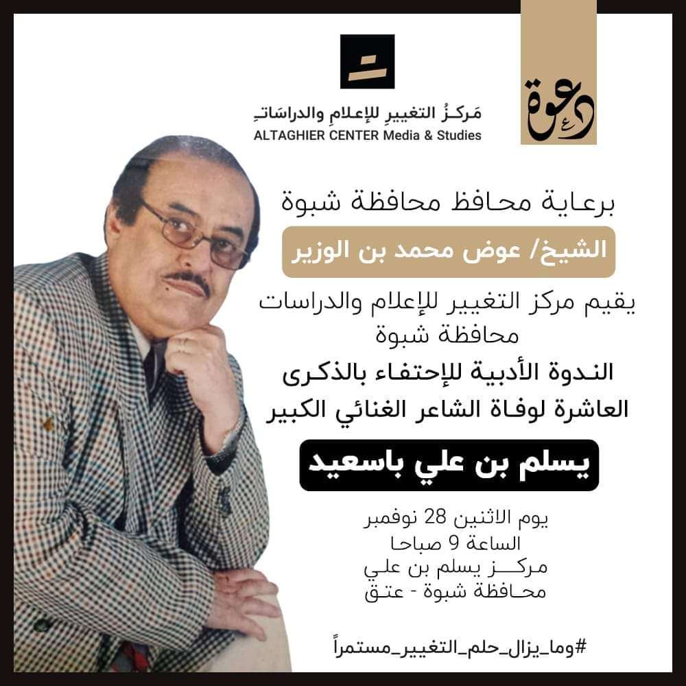 دعوة_عامة برعاية محافظ محافظة شبوة الشيخ عوض محمد بن الوزير يقيم مركز التغيير للإعلام والدراسات_ محافظة شبوة الندوة الأدبية، للإحتفاء بالذكرى العاشرة لوفاة الشاعر الغنائي الكبير يسلم بن علي باسعيد. الأثنين ٢٨ نوفمبر ٢٠٢٢م الساعة التاسعة صباحا. مركز الشاعر يسلم بن علي (المركز الثقافي) محافظة شبوة_ عتق.