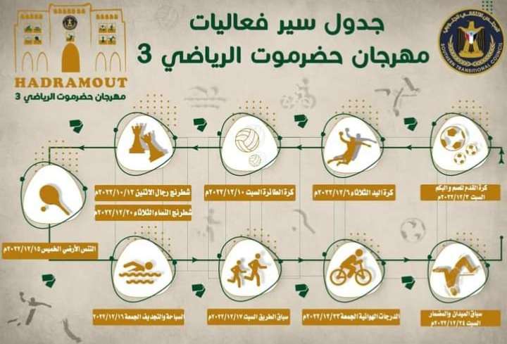 أعلنت إدارة الشباب والطلاب بالهيئة التنفيذية للقيادة المحلية للمجلس الانتقالي الجنوبي بحضرموت صباح اليوم جدول فعاليات ومنافسات مهرجان حضرموت الرياضي الثالث. وتنطلق منافسات المهرجان مغرب يوم السبت ٣ / ١٢ بلعبة كرة القدم الخماسية للصم والبكم في الملعب الصغير بملعب الفقيد بارادم بالمكلا. ويأتي هذا المهرجان الرياضي كتقليد سنوي تقيمه الإدارة برعاية الرئيس القائد عيدروس بن قاسم الزبيدي رئيس المجلس الانتقالي الجنوبي وإشراف العميد الركن سعيد أحمد المحمدي رئيس الهيئة التنفيذية للقيادة المحلية للمجلس الانتقالي الجنوبي بحضرموت. يذكر أن الأستاذ مؤمن السقاف رئيس دائرة الشباب والرياضة بالأمانة العامة للمجلس الانتقالي الجنوبي مستشار الرئيس قد أعلن عن موعد إنطلاق منافسات مهرجان حضرموت الرياضي الثالث عقب انتهاء مهرجان عدن الرياضي الثالث يوم أمس . ويتخلل المهرجان عشر ألعاب رياضية متنوعة أعلنت عنها الإدارة هذا العام.