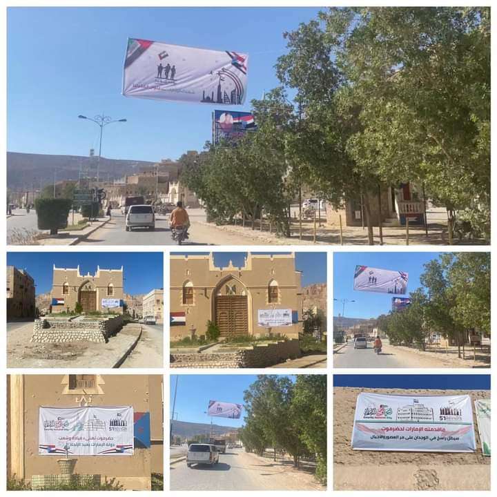 زينت لافتات وبنرات الأشقاء في دولة الإمارات، الشوارع الرئيسية والحيوية بمدن (سيئون, تريم, القطن) بوادي حضرموت بمناسبة الاحتفال بالذكرى ال55 لليوم الوطني الإماراتي "عيد الإتحاد". جاء رفع اللافتات والبنرات بالتزامن مع إقامة فعاليات شعبية ومهرجان فني وخطابي في سيئون يعبر عن مشاعر الإخاء والترابط الوثيق بين الشعبين الشقيقين وعمق العلاقة بين حضرموت والإمارات. وأعلنت الهيئة التنفيذية المساعدة للمجلس الانتقالي الجنوبي بوادي وصحراء حضرموت أن برنامج الفعاليات يأتي بهدف رد الوفاء والعرفان لحكام وشعب الإمارات، وتأكيد حجم العلاقات المتينة مع الإخوة الأشقاء وما يجمعهم من مصير مشترك لأجل نهضة وتنمية الأوطان العربية .